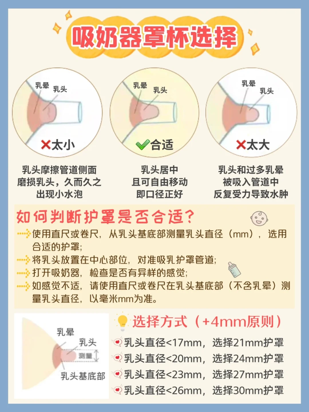🍀选用电动吸奶器,最好是双边的,排空的话可以节省时间,并且要选择适合乳头直径的喇叭罩,避免乳头水肿或擦伤。