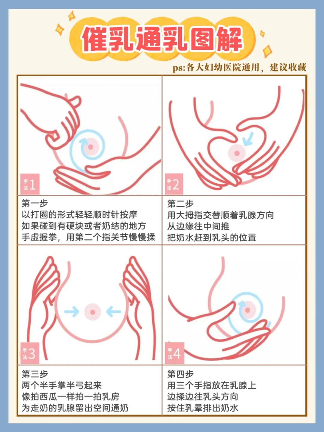 💦③没有奶水后再调到按摩模式,保持空吸3-5分钟,然后再利用休息间隙用毛巾热敷、手动按摩,让乳头放松柔软(图片上有按摩手法)