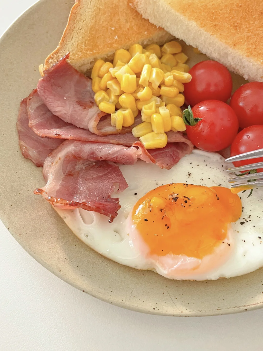 10.21早餐|清理冰箱的拼拼凑凑 拼盘就是营养满满和肚子饱饱都可以同时拥有[doge] 今日两人食- 吐司-小番茄-煎蛋-玉米-培根 ☕️冰拿铁 连续几天天气都很晴朗 和阳光一起共进早餐的感觉真是太棒了[派对R] 早安哇小伙伴们☀️