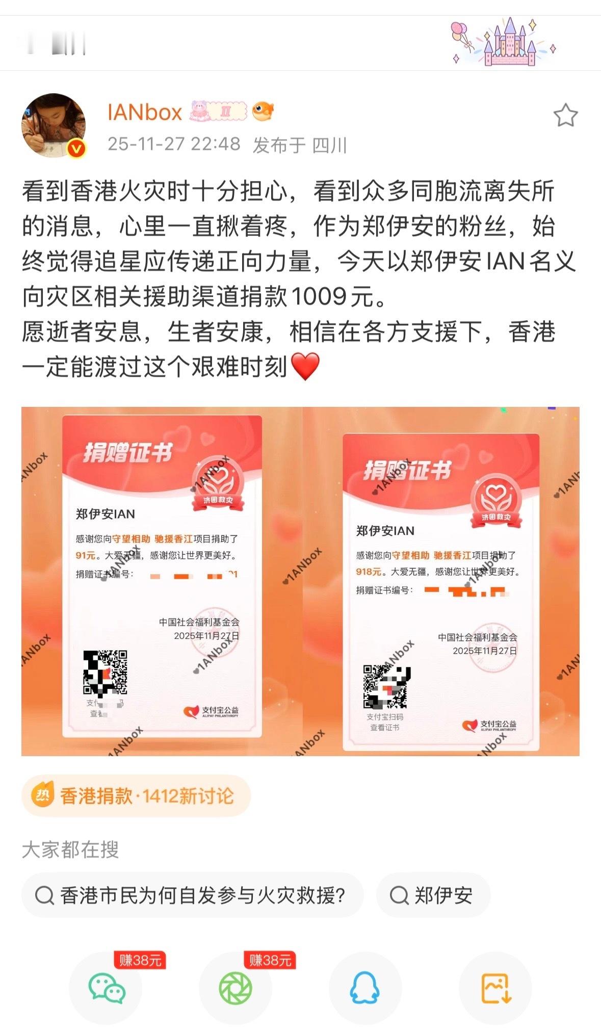 郑伊安大吧及站子为香港灾区自费捐赠共2018人民币,并送去物资