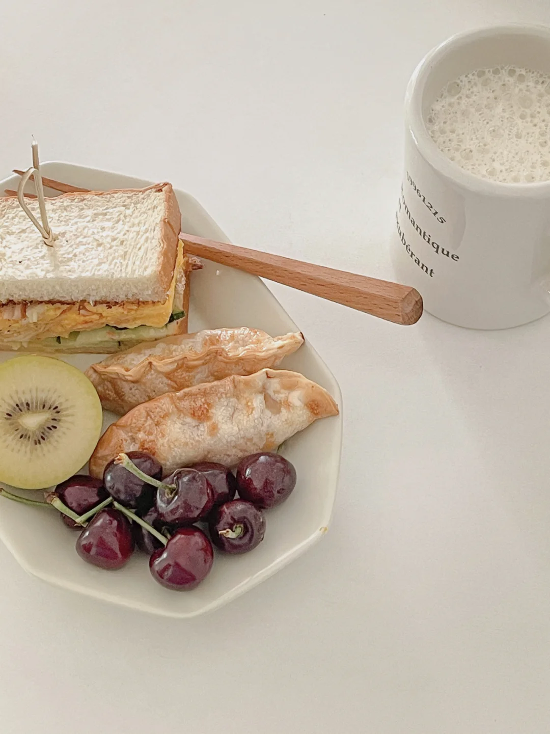 4.23早餐|青瓜真是太夏天了🍃 -车厘子,泡菜饺,猕猴桃,三明治,无糖豆浆 别问我为什么早上能吃下这么一大份[笑哭R] 晚餐没吃主食,晚间跟帕姐上了一节课 每天早晨都饿的饥肠辘辘哈哈哈! 今天是被锁死的青瓜滑蛋cp[色色R] 早安小伙伴们~