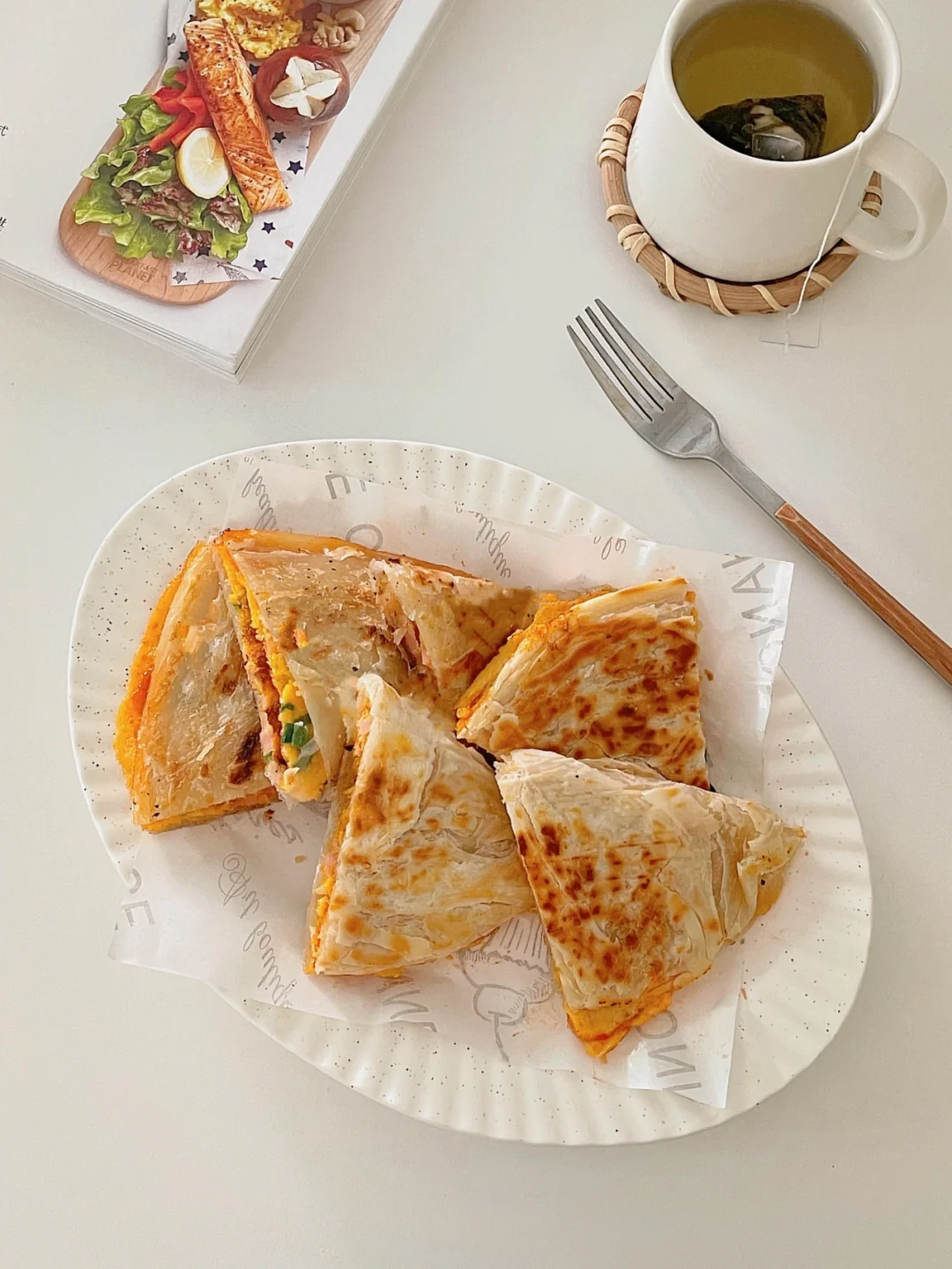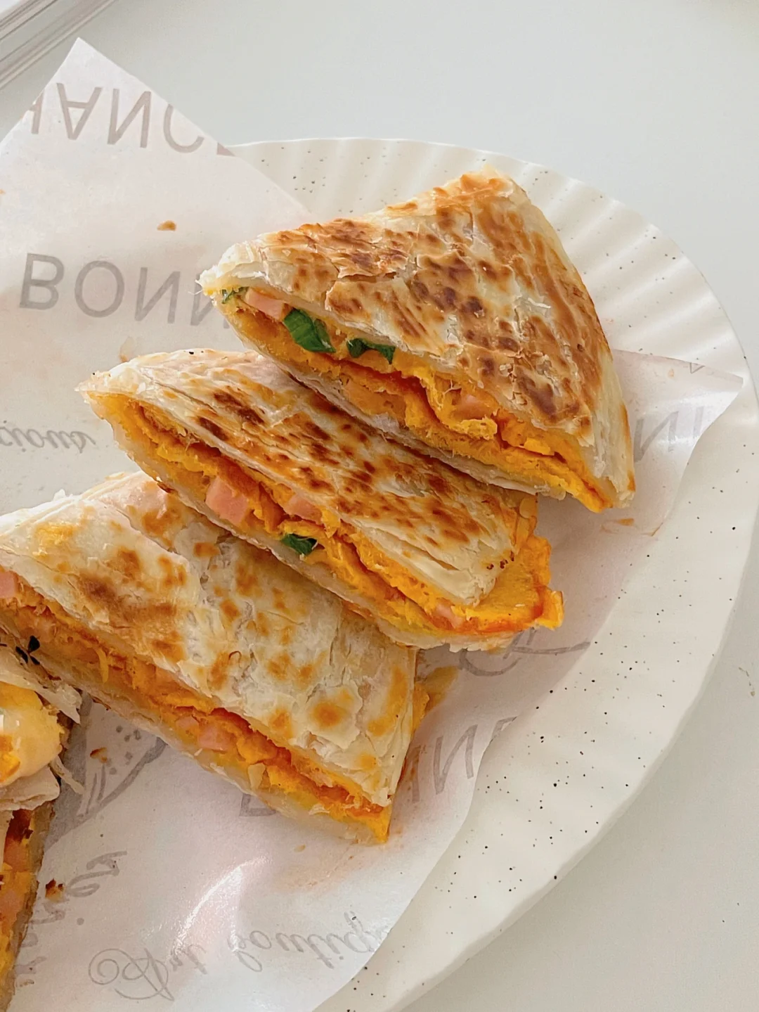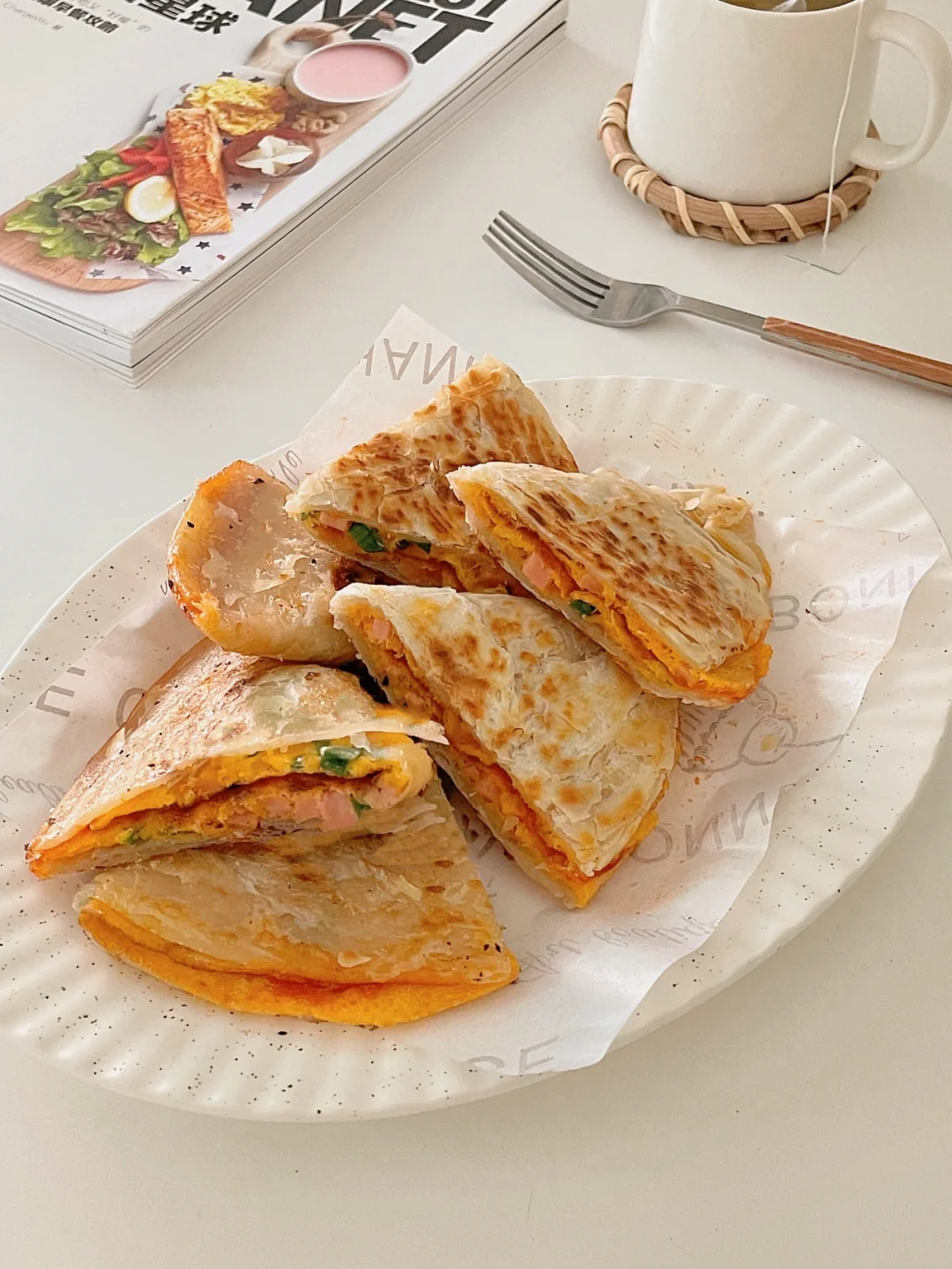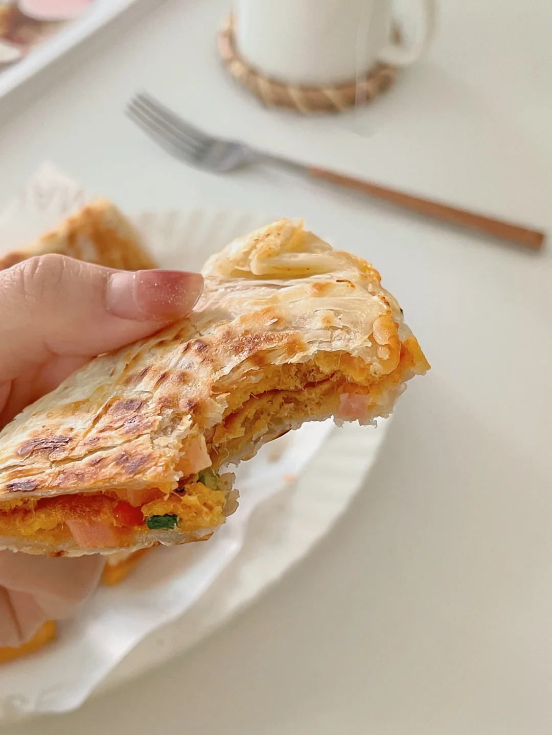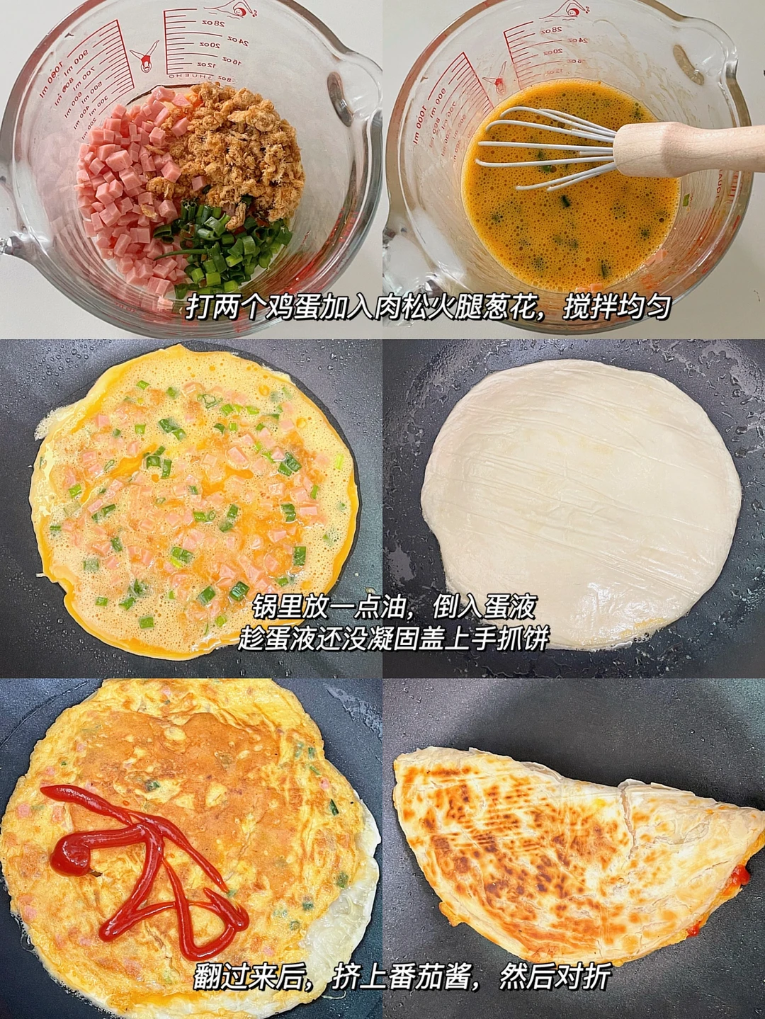 肉松搭配葱香,火腿加以点缀,口感酥酥脆脆! 这样的搭配真的是太绝了~ 姐妹们快安排起来[赞R] - 📝材料: 手抓饼 蛋 香葱 肉松 火腿 番茄酱 - 📝做法: 1️⃣把葱和火腿切碎备用 2️⃣打两个鸡蛋加入火腿碎,肉松和葱搅拌 3️⃣锅刷油 蛋液倒入进去 蛋液还位凝固时放上一张手抓饼,蛋液快凝固后翻面 挤上番茄酱 4️⃣整张饼对半折起 煎至两面金黄切三角块~ 就可以开吃啦!