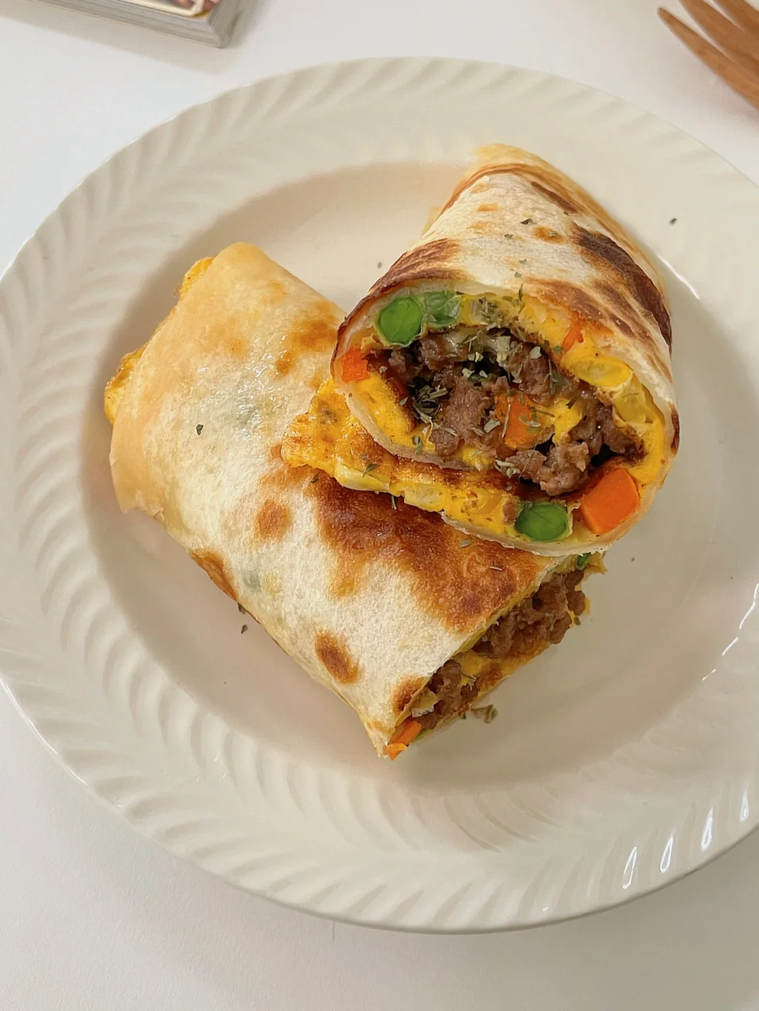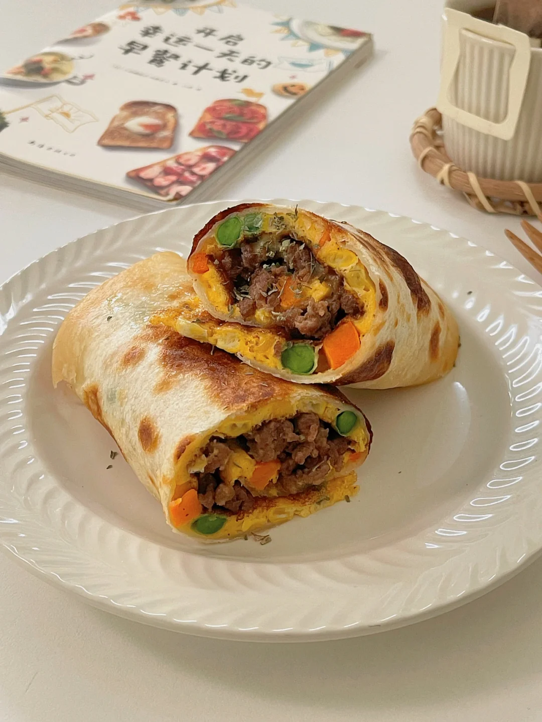 今日份快手减脂早餐 超好吃的牛肉鸡蛋卷~ 饱腹感十足 超级好吃呀[色色R] - 📝食材 牛肉末|鸡蛋2颗|杂蔬|芝士片|全麦饼皮 见图三详细教程🔎 - 📝制作 1️⃣锅里放油,把牛肉末煸炒+酱油+黑胡椒调味 盛出备用~ 2️⃣锅里放油,鸡蛋+杂蔬+黑胡椒搅均匀,倒进去 趁鸡蛋快要凝固的时候把饼皮盖上去 3️⃣翻面以后,铺上芝士片,把牛肉末铺上去 (建议全程小火) 4️⃣慢慢的卷起来,然后对半切就完成啦~