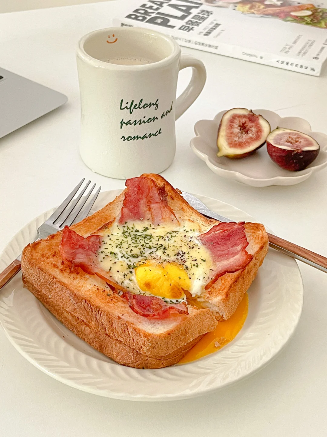 6.24早餐|吐司疯狂爱好者[doge] 改天出一个吐司N+1吃法合集[偷笑R] -无花果 鸡蛋 番茄酱 吐司 培根 芝士片 冰拿铁 📝: 准备2片吐司 1片用圆形模具(玻璃杯口)按出一个圆形⭕️ 第一片涂上番茄酱放一片芝士 按压的这片叠加在上面 铺上2条培根🥓交叉 中间窝一个鸡蛋🥚 送入烤箱 180度10min 想吃蛋黄全熟的可以烤到15min 最后撒上欧芹装饰即可~ 最喜欢这种快手又好吃的美食了[哭惹R] 流出来的蛋黄液好诱人[doge]