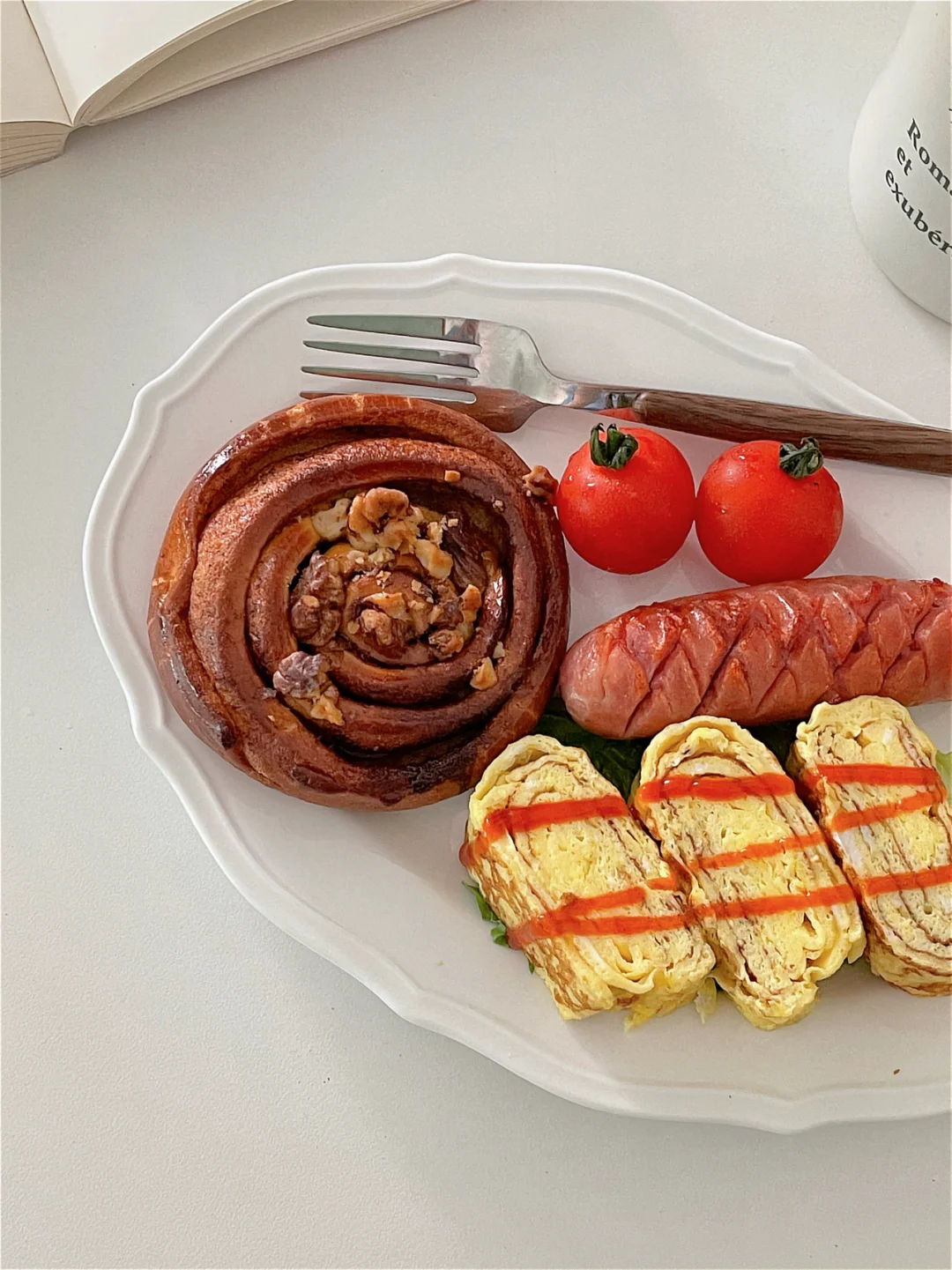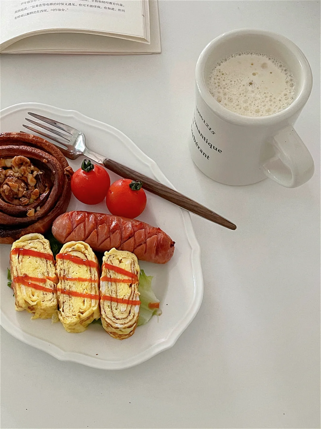 4.2早餐|最爱肉桂~ 每次下班再去买都没货! 难得昨天能买到[doge] -蛋卷,花刀肠,无糖豆浆,小番茄🍅 一盘干下去爽翻了[大笑R] 早安呀小伙伴们~