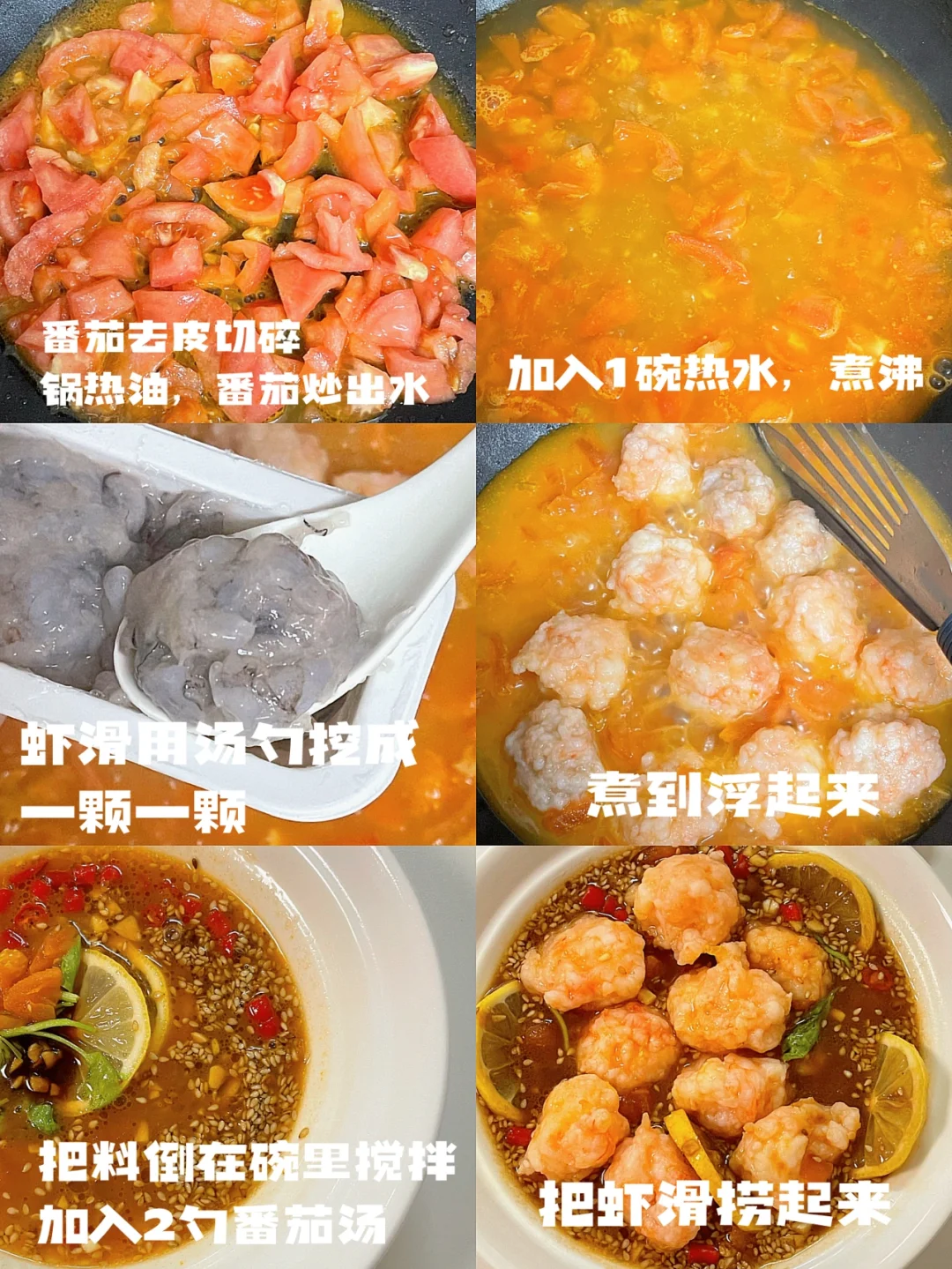 番茄汤底配上弹牙的虾滑,辣辣的料汁🥣