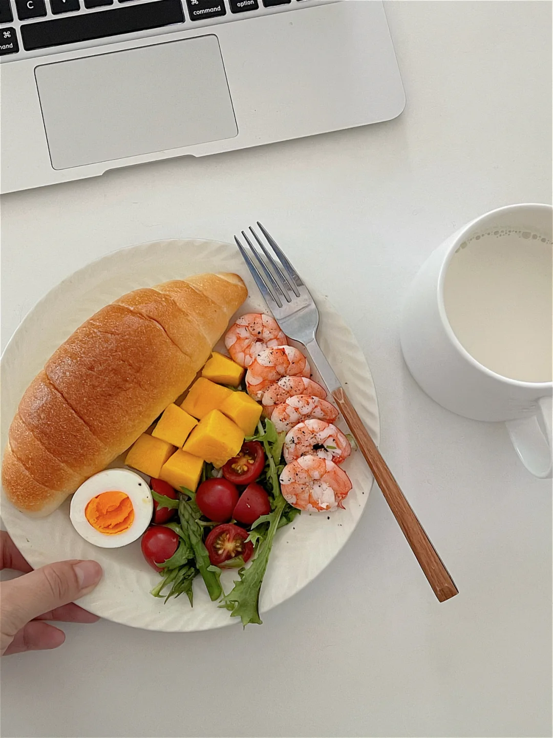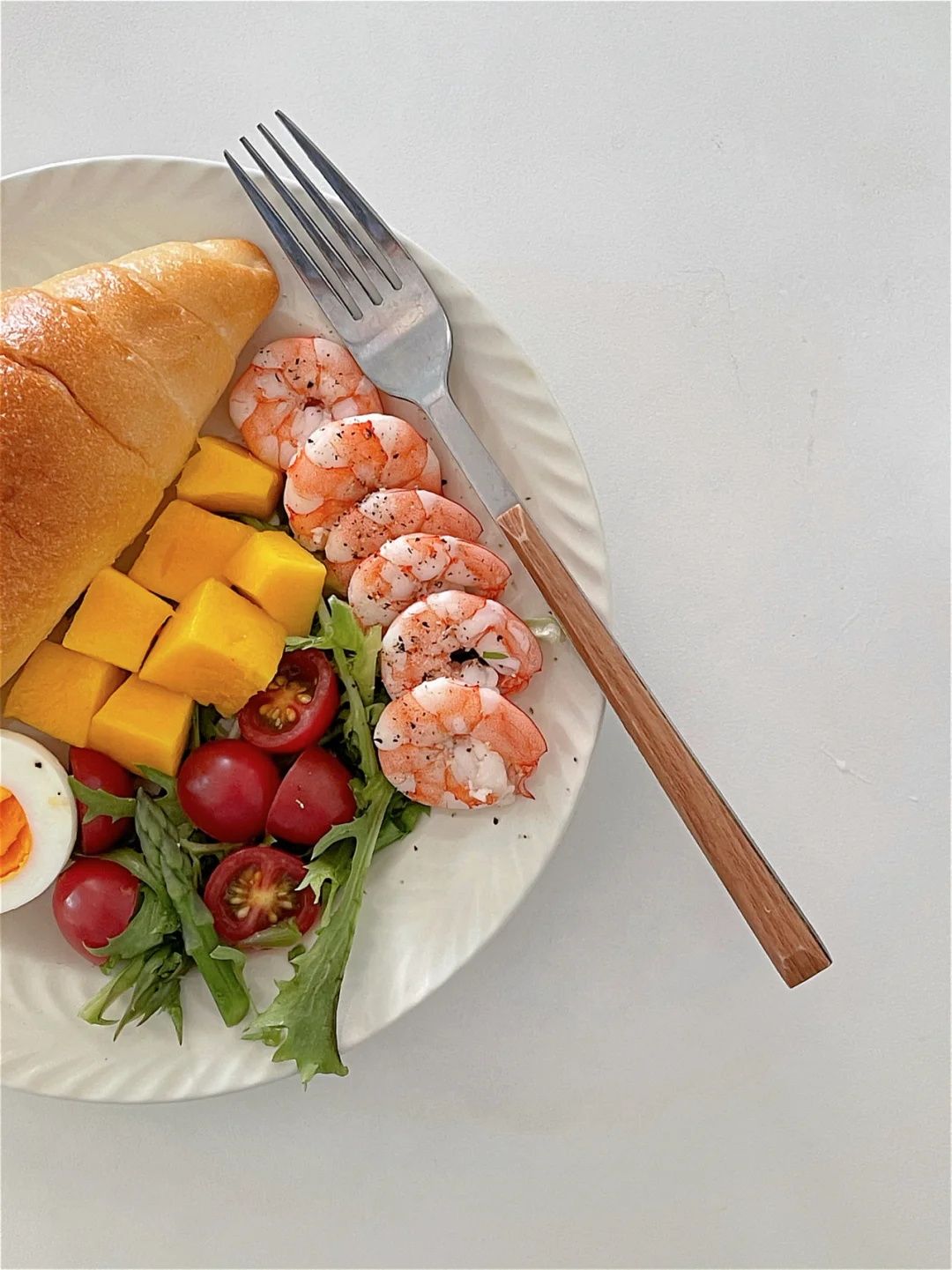 4.22早餐🥣|大虾仁儿🍤 -虾仁,芒果,苦菊,番茄,水煮蛋,牛奶 太方便快手了[派对R] 上班族早餐必备💼 -虾仁 剥壳提前用料酒黑胡椒腌制~ 这里我因为减脂,所以选择了水煮。 清清爽爽的一盘~ 巴适的很[赞R] 早安小伙伴们☀️