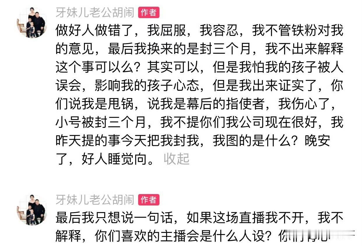 胡闹小号疑因回应泼汽油事件,提了菲妹被粉丝举报封三个月!(侵犯他人名誉权) 做好人做错了,我屈服,我容忍,我不管铁粉对我的意见,最后我换来的是封三个月,我不出来解释这个事可以么?其实可以,但是我怕我的孩子被人误会,影响我的孩子心态,但是我出来证实了,你们说我是甩锅,说我是幕后的指使者,我伤心了,小号被封三个月,我不提你们我公司现在很好,我昨天提的事今天把我封我,我图的是什么? 最后我只想说一句话,如果这场直播我不开,我不解释,你们喜欢的主播会是什么人设?你们有心么?