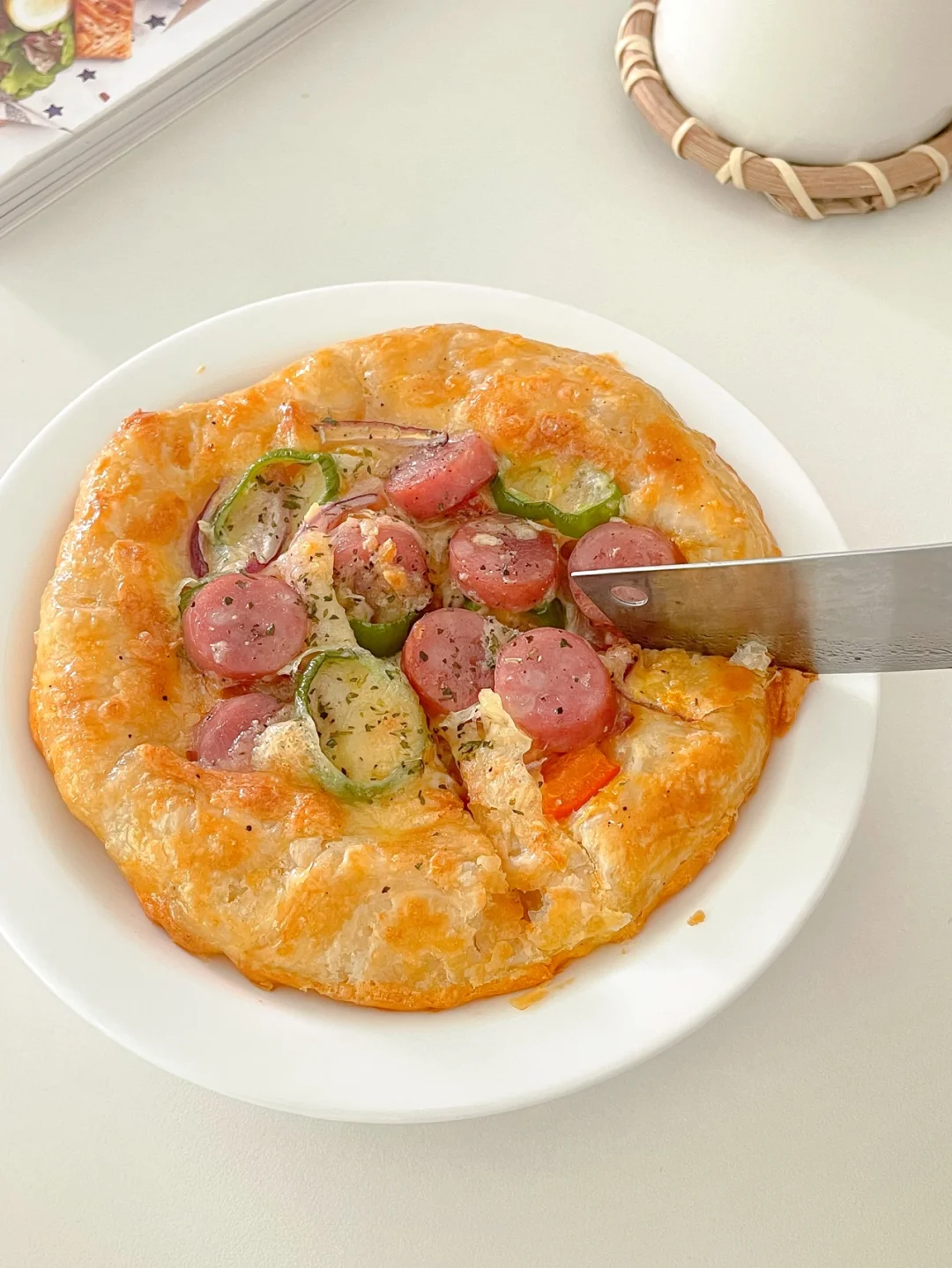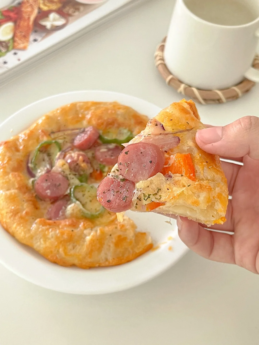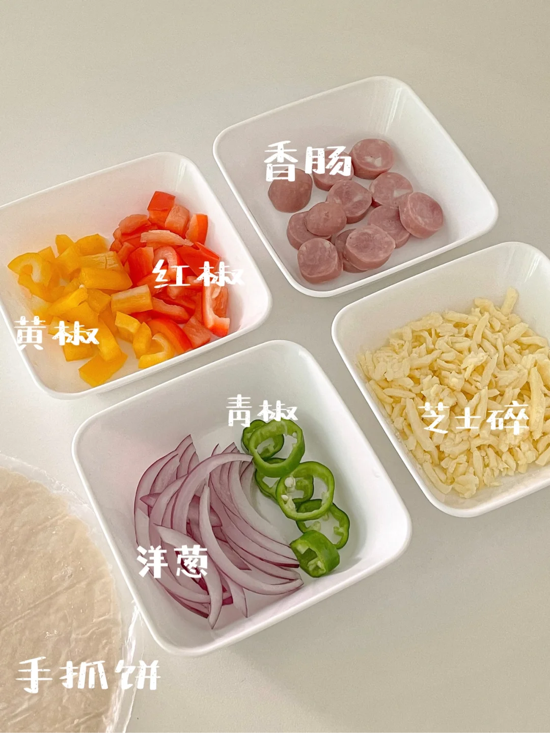 11.16早餐🥣|今天又是消耗手抓饼的一天 花样吃法get 味道💯 食材见图三 -香肠 青椒 红椒 黄椒 洋葱 芝士碎 手抓饼 📝 -香肠,彩椒,改刀切备用 -手抓饼提前解冻,围着撒上一圈芝士碎 把边边卷起来按紧⚠️ -在中间涂上番茄酱,把准备好的所有食材码上去 -在最上面撒一层芝士碎,黑胡椒封层 -在手抓饼边刷上一层蛋黄液 送入烤箱200度13-15分钟(温度仅供参考) 出炉撒上一层欧芹碎即可享用美味 早餐搭配一杯银耳羹~ 3分钟开水冲泡即食超级方便 好吃又好喝,无糖喝起来更没负担哈哈