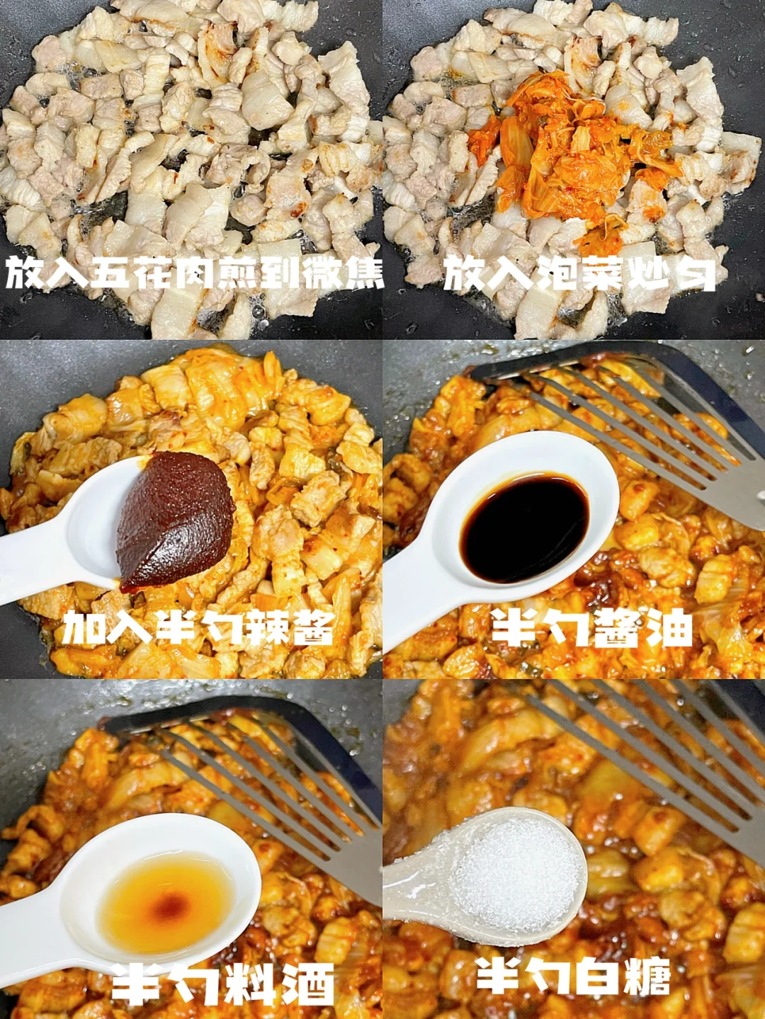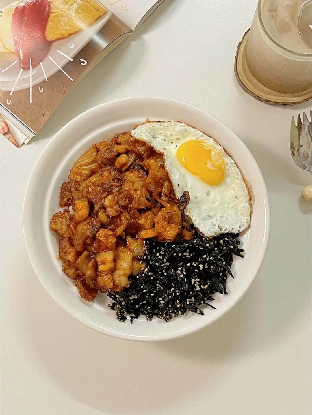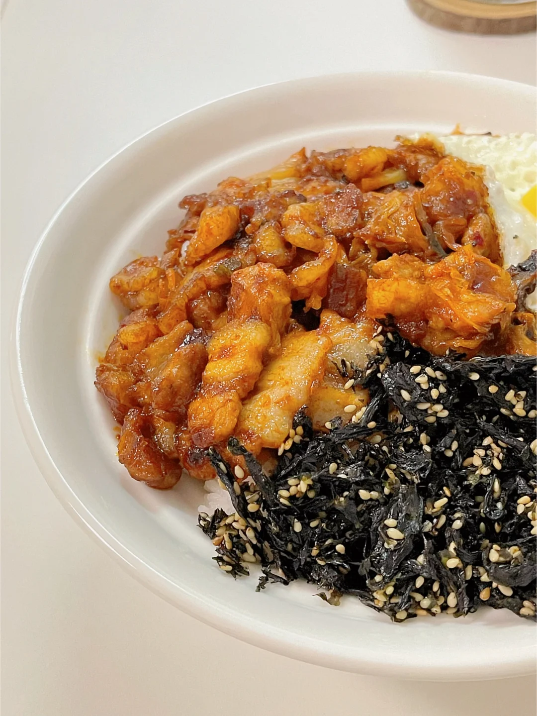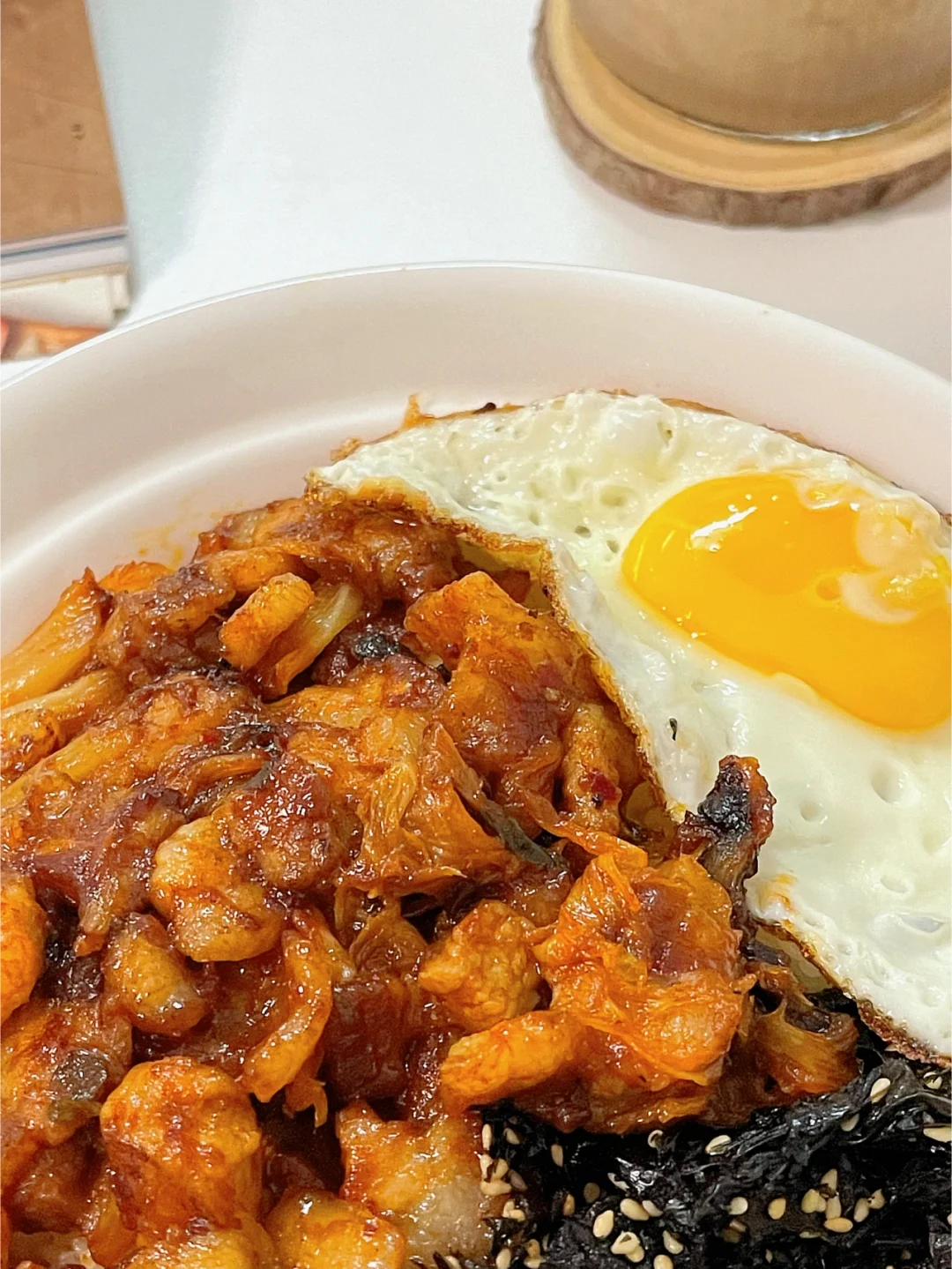 喜欢吃韩料的宝子们,一定要试试这个拌饭 焦香浓郁的五花肉混合着酸辣泡菜 很难让人不爱!!太好吃了[哭惹R] - 📝原材料: 五花肉|紫菜碎|米饭|煎蛋|泡菜 - 详细步骤看图三🔍 1️⃣先米泡20分钟,煮好备用 2️⃣五花肉切片,锅里放油把五花肉煎香 (金黄金黄的焦感) 3️⃣加入泡菜炒匀,依次加入 韩式辣酱-酱油-料酒-白糖 4️⃣最后炒匀后,和提前煎好的蛋,紫菜碎 码上米饭即可 - 跟着我一起,把蛋黄戳破~ 把五花肉和泡菜与大米饭拌匀! 大勺子开始造起来🥄👍