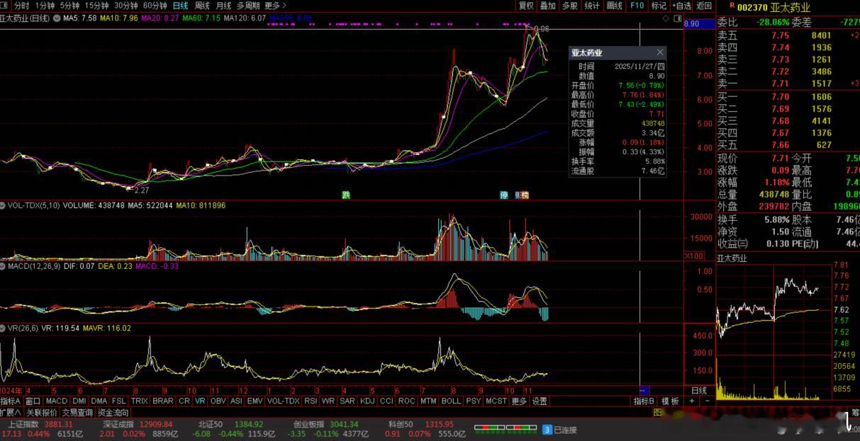 【财富晚茶-午间投资】午盘尾盘:突发养老龙头涨停;亚太药业:前期见顶冲刺前高;沪深北证:体育反弹渔业回调 一、午盘尾盘:突发养老,利好涨停1、突发利好,垂直涨停第一、临近午盘养老概念突然爆发:11月27日早间,A股小幅上扬,深证成指一度冲上13000点,创业板指盘中冲击3100点,上证指数、科创50、沪深300等也纷纷高开高走。上涨个股远多于下跌个股,成交保持平稳。第二、盘面视野涨停潮涌通信设备、固态电池等涨幅居前。弱势群体:影视院线、云服务、海南自贸等板块跌幅居前。第三、临近午盘养老异动瞬间拉升:悦心健康:直线涨停。强势冲高:欧圣电气、亚华电子、信隆健康、奥佳华、澳洋健康等。2、消息27日:国办吹风第一、国务院消息面层面时间节点:11月27日,国新办举行国务院政策例行吹风会。介绍增强:消费品供需适配性进一步促进消费政策措施有关情况。第二、工信部说会同养老协同推进:会同有关:部门加强养老服务机器人、适老鞋服、易吞咽食品等产品研发。谢远生说道:对标《关于增强消费品供需适配性进一步促进消费的实施方案》:到2027年:形成3个万亿级消费领域和10个千亿级消费热点。其中之一:万亿级消费领域包括老年用品、智能网联汽车、消费电子。第三、消费电子利好频频消费电子:早间走强。板块指数:一度放量大涨逾4%。第三、股价逼近历史最高昀冢科技:开盘仅约10分钟20%涨停,股价逼近历史最高点。联得装备:20cm封板。快速涨停:道明光学、福日电子、睿能科技等均在几分钟内潮涌涨停板。二、透析市场:风口公司,上下起伏亚太药业 盘中01涨1、震荡突破:六年箱底视野盘面:前期见顶,冲刺前高:2025-11-30 截至11:00:股价报收:7.70元。股指上涨:1.05%。成交总量::438900手,成交金额:3.34亿元。总换手率5.89%,观总市值:57.42亿元。流通市值:57.34亿元。2、医药研产:行业翘楚主营业务:医药研产和销售。公司品牌:集研产销售一体综合型医药头部企业。3、营收减少:净利优秀业绩好转:2025-09-30 三季度报:公司营收:2.2831亿 同比增-25.59%。公司净利:9719.5012万 同比增2909.49%。三、创作不易:优质网易,财经作者投资投机迷茫之中:给予尽可能有帮助:资本市场风险自负。(优雅端庄晚风《网易号》财经领域创作者和原创作者 违者必究)