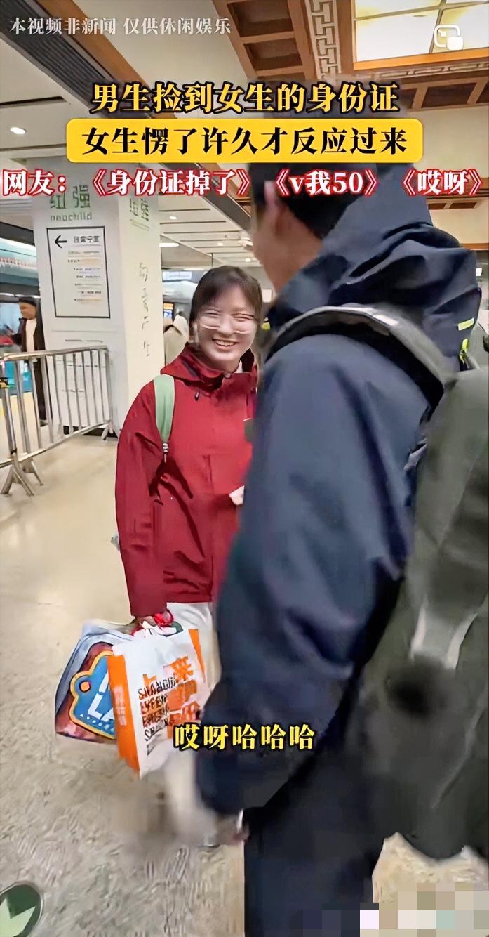 女生在地铁站听见有人喊自己名字,回头发现是个高大男生挥着她的身份证。 她笑嘻嘻