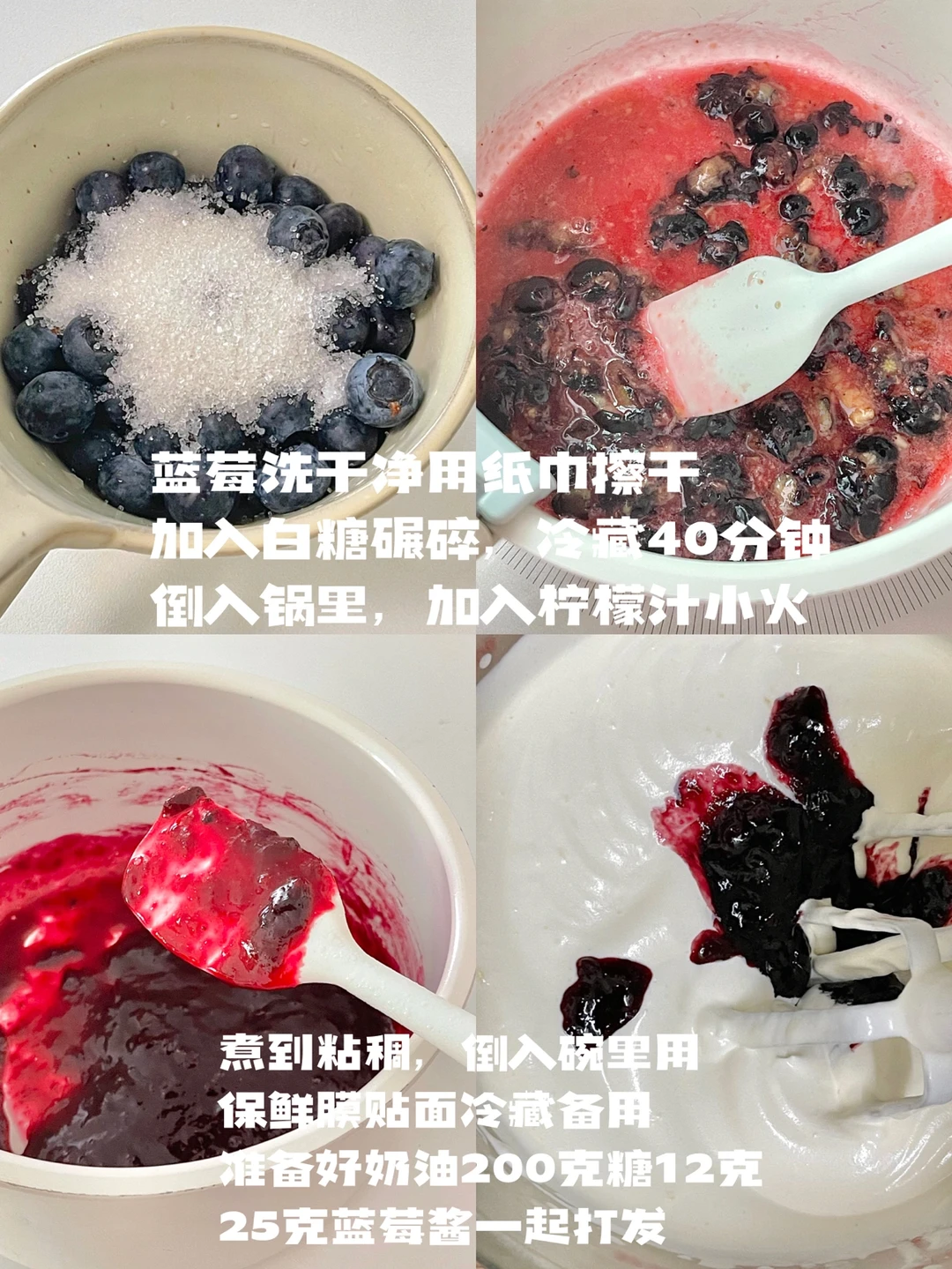 6️⃣提前拿出冷藏好,200克的奶油加入25克的蓝莓酱,12克的白砂糖打到非常硬挺状态