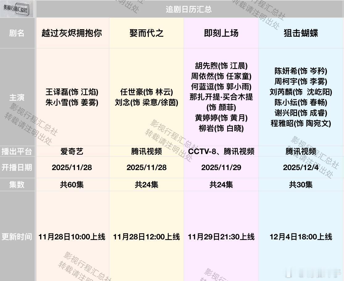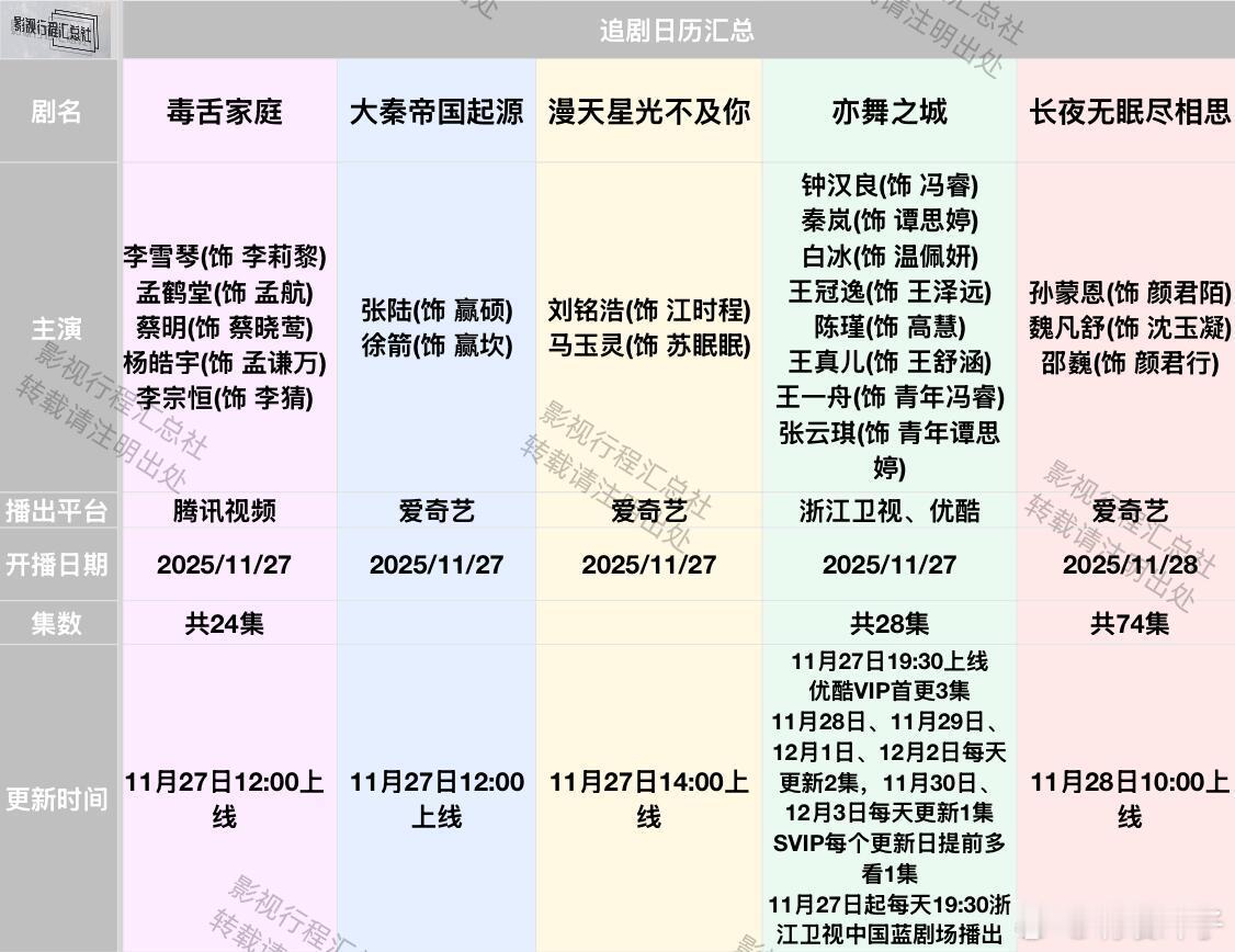 暗影侦探1127、亦舞之城1127、狙击蝴蝶1204追剧日历更新:11.27-12.4日开播剧《反派千金上位计》袁凯凯(饰 白栖泽) 叶舒予(饰 白浅) 爱奇艺 2025/11/27《江湖夜雨终似梦》严子贤(饰 江湖) 闵星翰(饰 夜雨) 向婧怡(饰 姬娘) 芒果TV 2025/11/27《暗影侦探》王星越(饰 关岑) 吴佳怡(饰 陆以真) 邵伟桐(饰 杜霖风) 张沐兮(饰 司敏)美娜(饰 丁尔宜)芮伟航(饰 阿东)爱奇艺2025/11/27《月拢雁西归》刘也(饰 南辰筱)谭晓凡(饰 芮祤)代佳莉(饰 燕萝)徐思雨(饰 乔又仪)刘国豪(饰 燕霖)腾讯视频2025/11/27《毒舌家庭》李雪琴(饰 李莉黎) 孟鹤堂(饰 孟航) 蔡明(饰 蔡晓莺) 杨皓宇(饰 孟谦万) 李宗恒(饰 李猜) 腾讯视频 2025/11/27《大秦帝国起源》张陆(饰 赢硕)徐箭(饰 赢坎)爱奇艺2025/11/27《漫天星光不及你》刘铭浩(饰 江时程)马玉灵(饰 苏眠眠)爱奇艺2025/11/27《亦舞之城》钟汉良(饰 冯睿)秦岚(饰 谭思婷)白冰(饰 温佩妍)王冠逸(饰 王泽远)陈瑾(饰 高慧)王真儿(饰 王舒涵)王一舟(饰 青年冯睿)张云琪(饰 青年谭思婷)浙江卫视、优酷2025/11/27《长夜无眠尽相思》孙蒙恩(饰 颜君陌) 魏凡舒(饰 沈玉凝) 邵巍(饰 颜君行) 爱奇艺 2025/11/28《越过灰烬拥抱你》王译磊(饰 江焰)朱小雪(饰 姜雾)爱奇艺2025/11/28《娶而代之》任世豪(饰 林云)刘念(饰 梁意/徐茵)腾讯视频2025/11/28《即刻上场》胡先煦(饰 江晨) 周依然(饰 任家童) 何蓝逗(饰 郭小雨) 那扎开提·买合木提(饰 颜菲) 黄婷婷(饰 黄月) 柳岩(饰 白晓) CCTV-8、腾讯视频 2025/11/29《狙击蝴蝶》陈妍希(饰 岑矜)周柯宇(饰 李雾)刘芮麟(饰 沈屹阳)陈小纭(饰 春畅)谢兴阳(饰 成睿)程雅昭(饰 陶宛文)腾讯视频2025/12/4