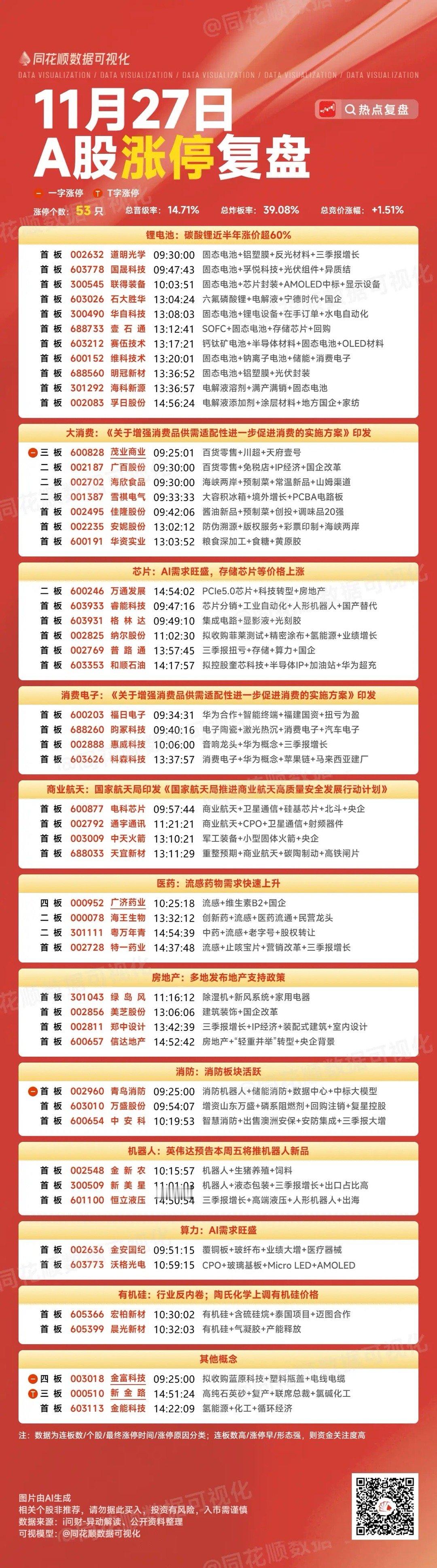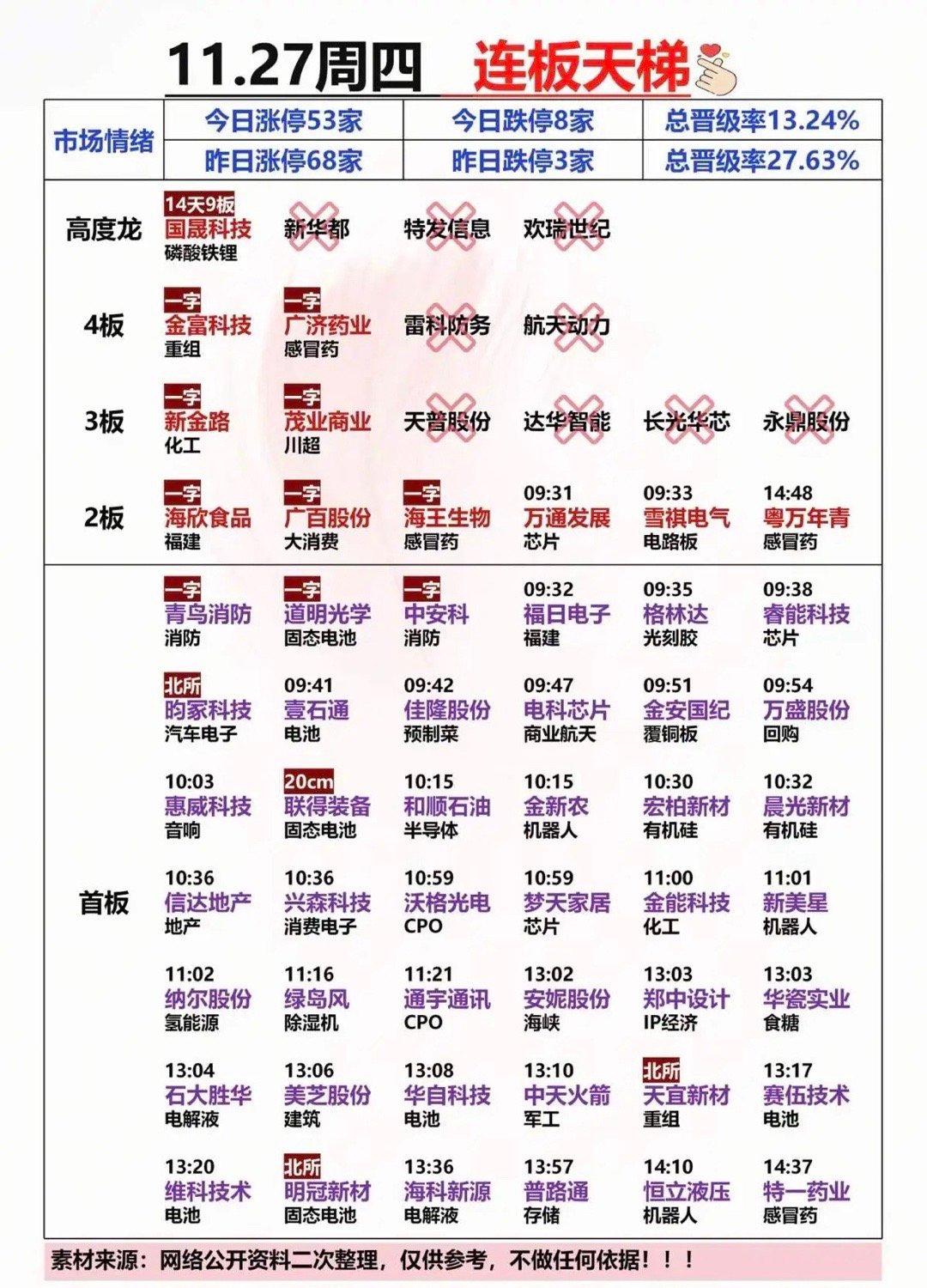 11月27日,今日涨停复盘(涨停53个),包括锂电池、大消费、芯片、消费电子等板块,市场情绪面不佳,还在酝酿行情。1、四连板:金富科技、广济药业3、三连板:新金路、茂业股份4、二连板:万通发展、海王生物、大洋电机、广百股份、海欣食品、粤万年青5、首板:国晟科技、格林达、福日电子、和顺石油、晨光新材、电科芯片等、