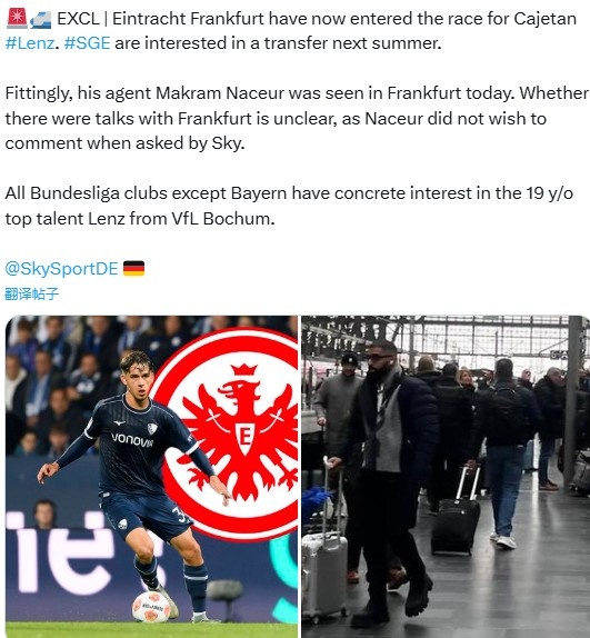 本周四,伦茨的经纪人马克拉姆·纳赛尔出现在法兰克福,但是否与法兰克福进行了会谈尚不清楚,因为纳赛尔在接受天空体育采访时拒绝发表评论。除了拜仁之外,所有德甲俱乐部都对这位来自波鸿的年轻天才表示了浓厚的兴趣。