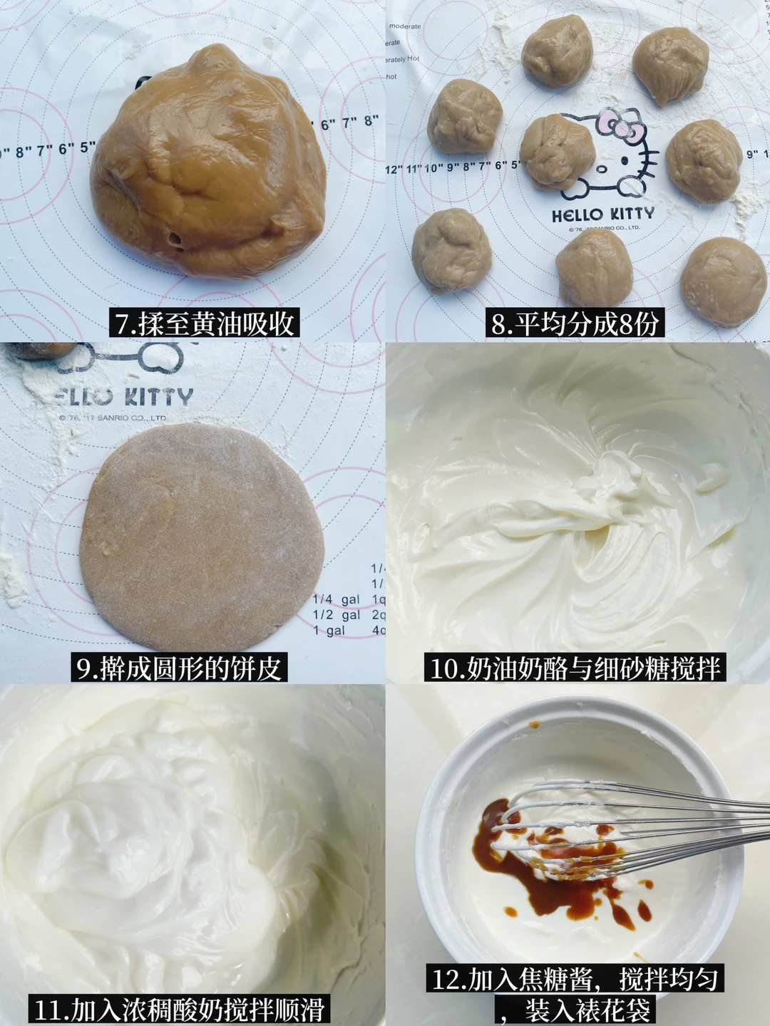 3️⃣奶油奶酪与细砂糖隔热水搅拌顺滑,依次加入浓稠酸奶与焦糖酱搅拌均匀。装入裱花袋