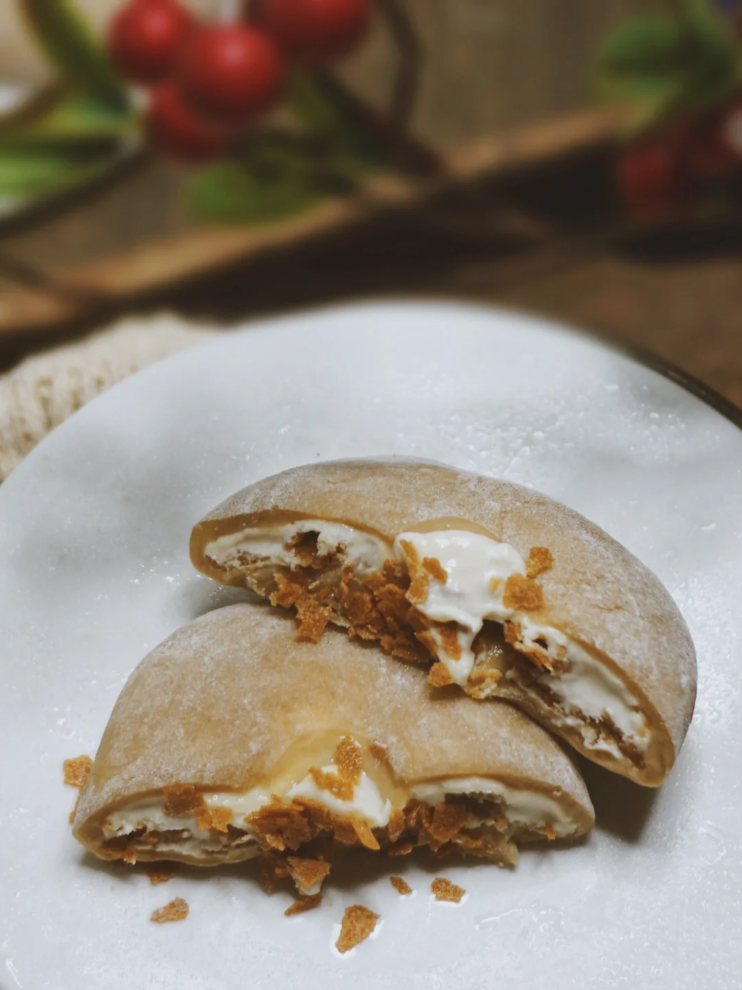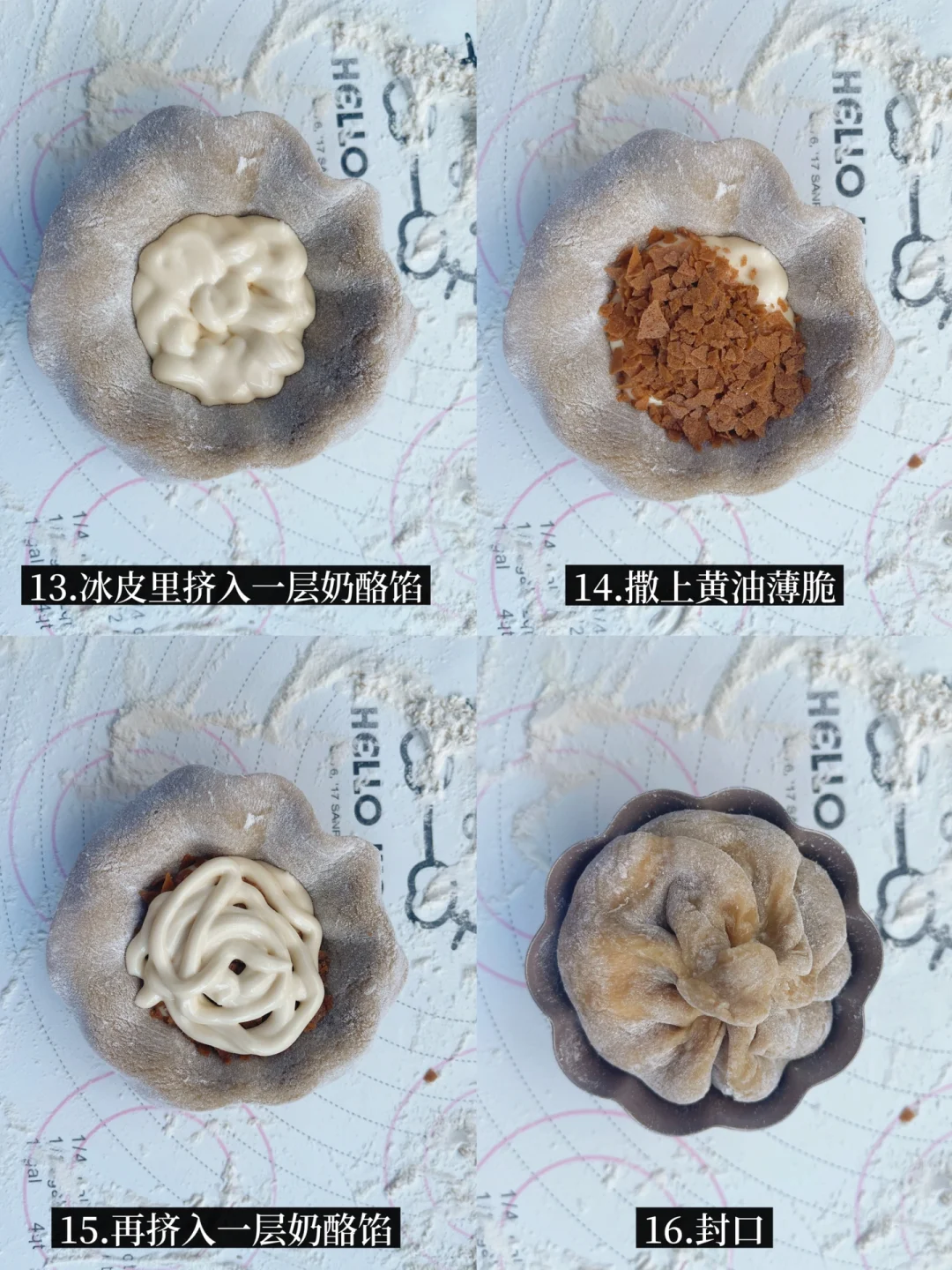 4️⃣擀好的圆皮放入雪媚娘模具里,挤入一层奶酪馅,中间放黄油薄脆,再挤入一层奶酪馅,包起来,剪掉多余部分,中间按个洞。