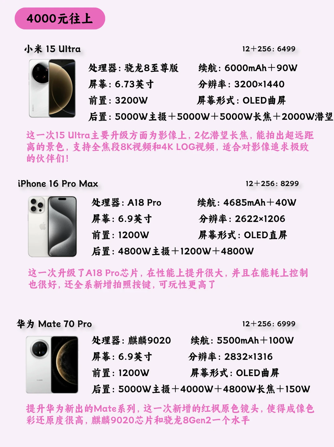 小米 15 UItra、iPhone 16 Pro Max、华为 Mate 70 Pro