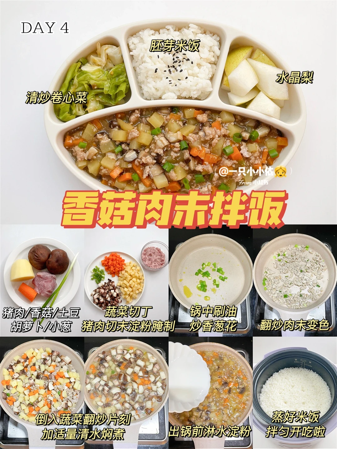🔹步骤:蔬菜切丁,猪肉切末淀粉腌制;锅中刷油炒香葱花,翻炒肉末变色,倒入蔬菜翻炒片刻,加适量清水焖煮,出锅前淋入水淀粉;蒸好米饭拌匀开吃啦