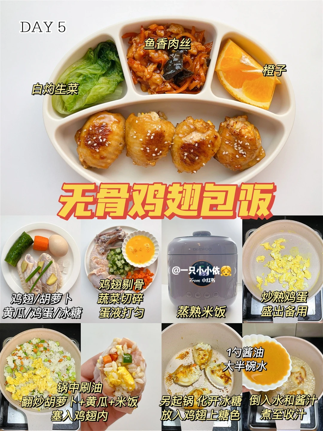 🔹步骤:鸡翅剔骨,蔬菜切丁,蛋液打匀,电饭煲蒸熟米饭;炒熟鸡蛋盛出备用;锅中刷油,翻炒胡萝卜、黄瓜、米饭,再塞入鸡翅内;另起锅化开冰糖,放入鸡翅上糖色,倒入水和酱汁(1勺酱油、大半碗水),煮至收汁
