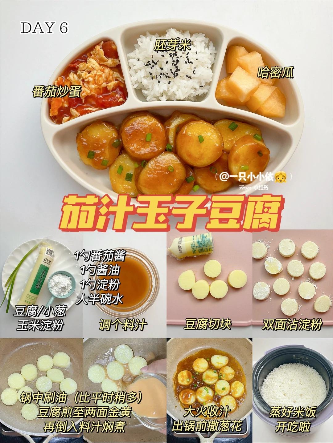 🔹步骤:调个料汁,1勺番茄酱+1勺酱油+1勺淀粉+大半碗水,豆腐切块,双面粘一层淀粉;锅中刷油(比平时稍多),豆腐煎至两面金黄,再倒入料汁焖煮;大火收汁,出锅前撒葱花,蒸好米饭开吃啦