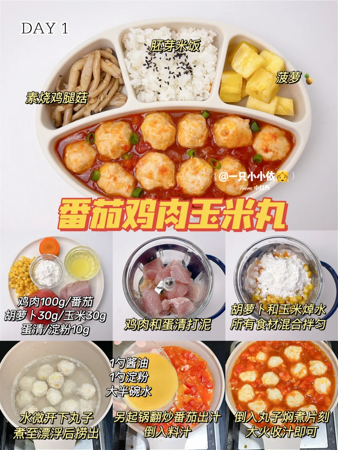 🔹步骤:鸡肉和蛋清打泥,胡萝卜和玉米焯水,所有食材混合拌匀;水微开下丸子,煮至漂浮后捞出;另起锅翻炒番茄出汁,倒入料汁(1勺酱油、1勺淀粉、大半碗水),倒入丸子焖煮,大火收汁即可