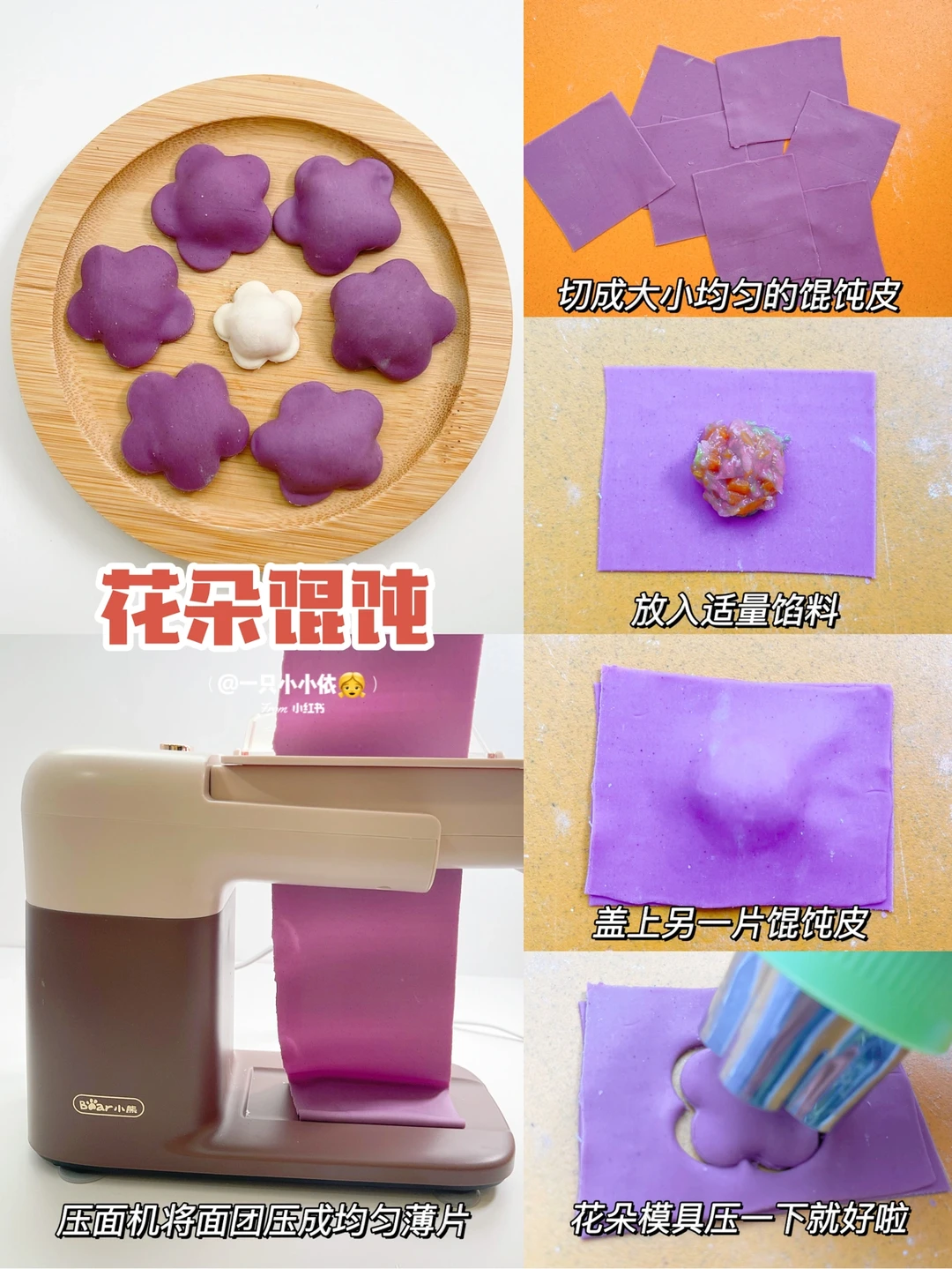 🔸步骤:馄饨皮放入适量馅料,盖上另一片馄饨皮,花朵模具压一下就好啦