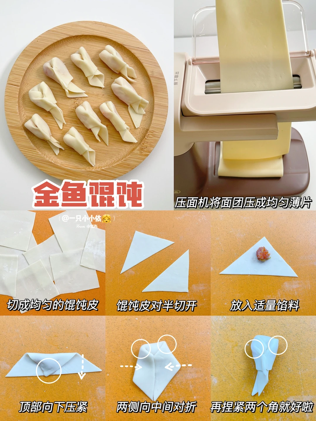 🔸步骤:馄饨皮对半切开,放入适量馅料;顶部向下压紧,两侧向中间对折,再捏紧两边