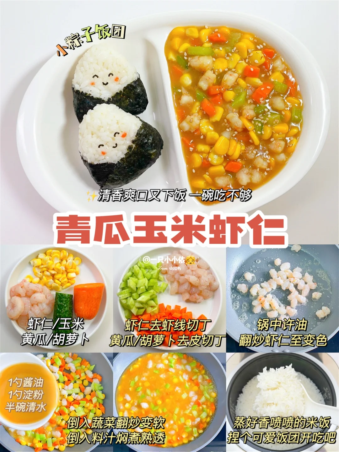 🔸步骤:虾仁去虾线切丁,黄瓜+胡萝卜去皮切丁;锅中刷油,翻炒虾仁至变色;倒入蔬菜翻炒变软,再倒入料汁焖煮熟透(1勺酱油+1勺淀粉+半碗清水);电饭煲煮好香喷喷的米饭,捏个小粽子饭团开吃✅