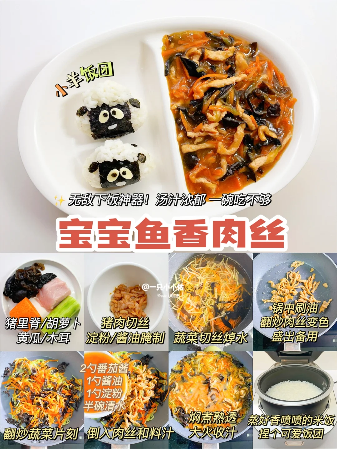 🔸步骤:猪肉切丝,淀粉+酱油腌制,蔬菜切丝焯水;锅中刷油,翻炒肉丝变色,盛出备用;翻炒蔬菜片刻,倒入肉丝和料汁(2勺番茄酱+1勺酱油+1勺淀粉+半碗清水),焖煮熟透,大火收汁;电饭煲煮好香喷喷的米饭,捏个小羊饭团开吃✅