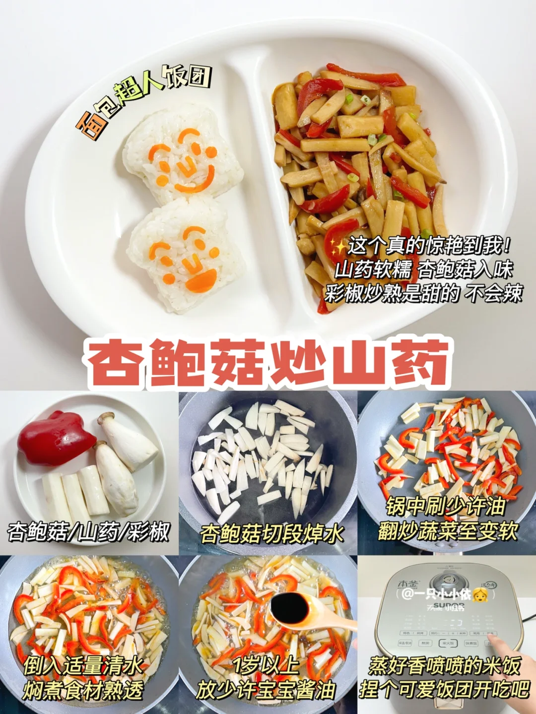 🔸步骤:杏鲍菇切段焯水;锅中刷油,翻炒杏鲍菇和彩椒至变软;倒入适量清水,焖煮食材熟透;1岁以上放少许宝宝酱油;煮好米饭捏面包超人饭团