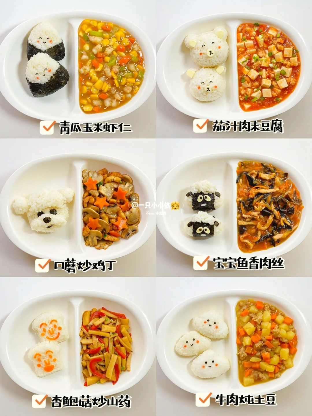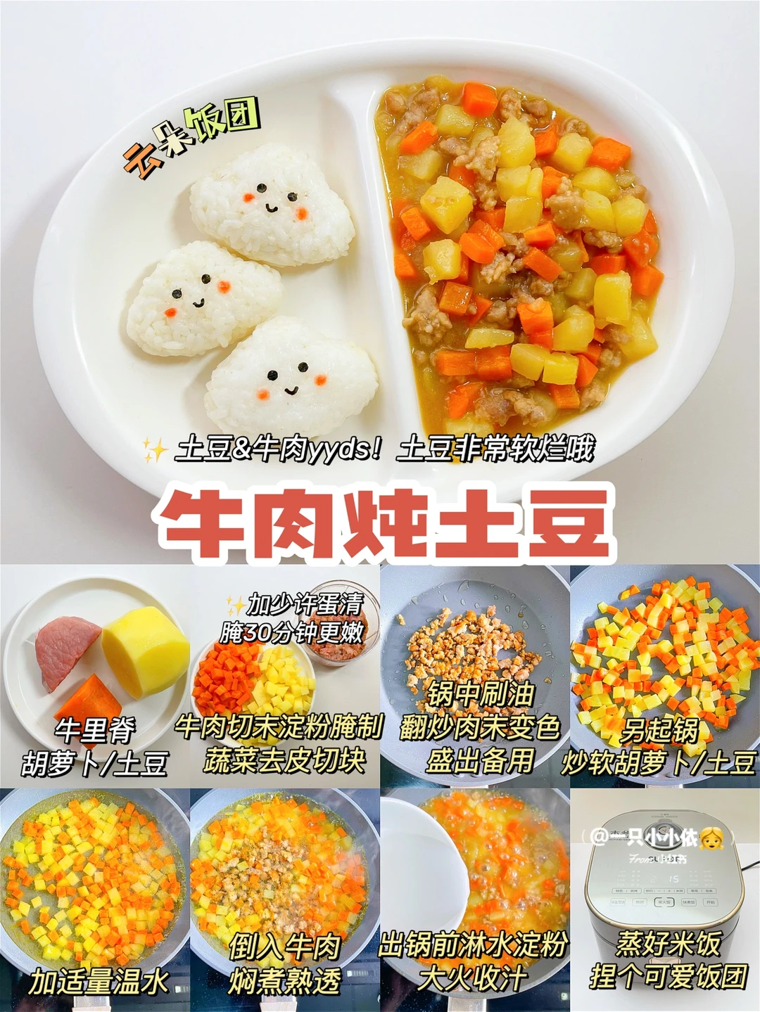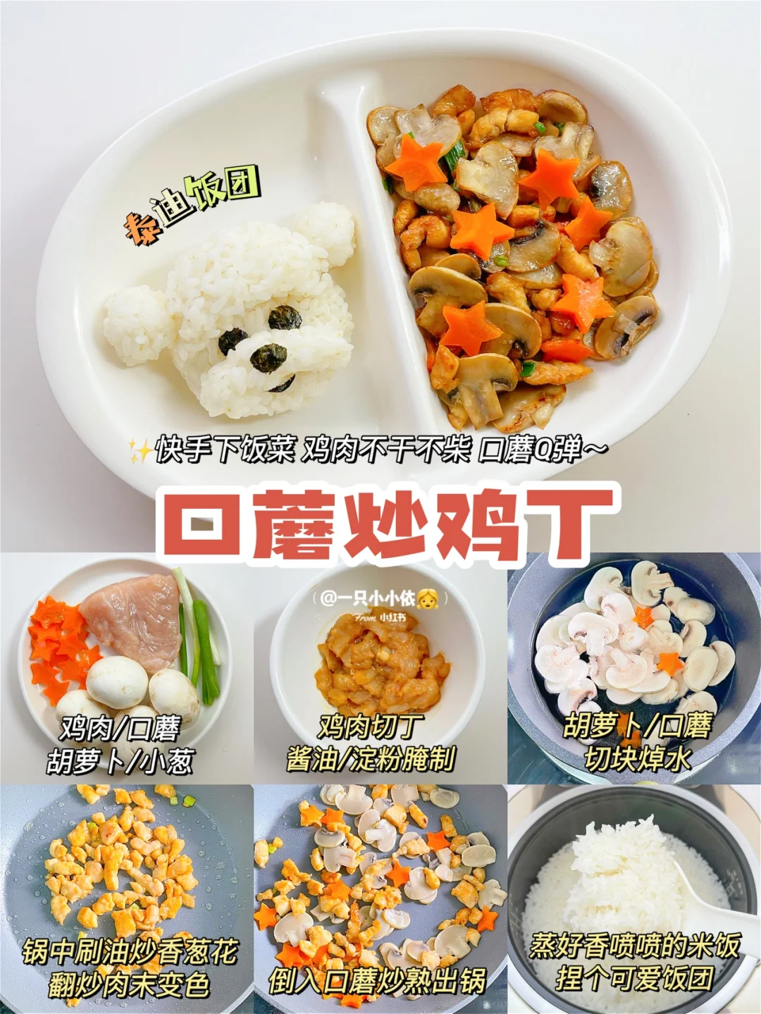 🔸步骤:鸡肉切丁,少许酱油+淀粉腌制;胡萝卜和口蘑切块焯水;锅中刷油炒香葱花,翻炒肉末变色,倒入口蘑炒熟出锅;电饭煲煮好香喷喷的米饭,捏个泰迪饭团饭团开吃✅