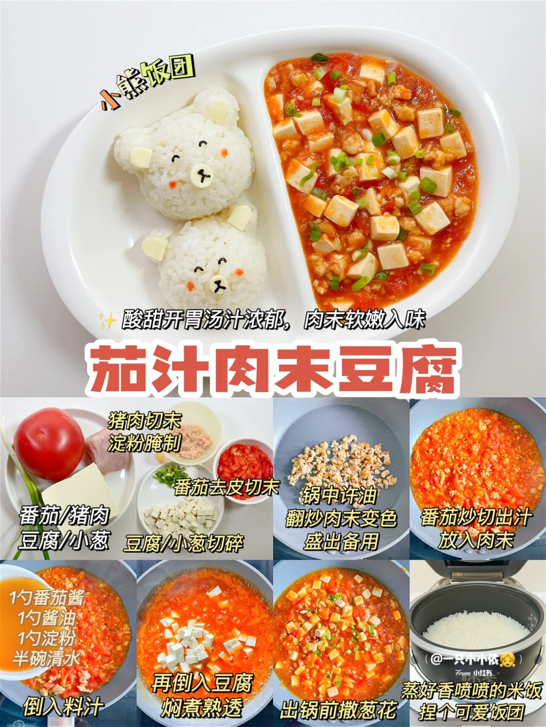 🔸步骤:猪肉切末淀粉腌制,番茄去皮切末,豆腐/小葱切碎;锅中刷油,翻炒肉末变色,盛出备用;番茄翻炒出汁,放入肉末,倒入料汁(1勺番茄酱+1勺酱油+1勺淀粉+半碗清水);再倒入豆腐焖煮熟透,出锅前撒葱花✅