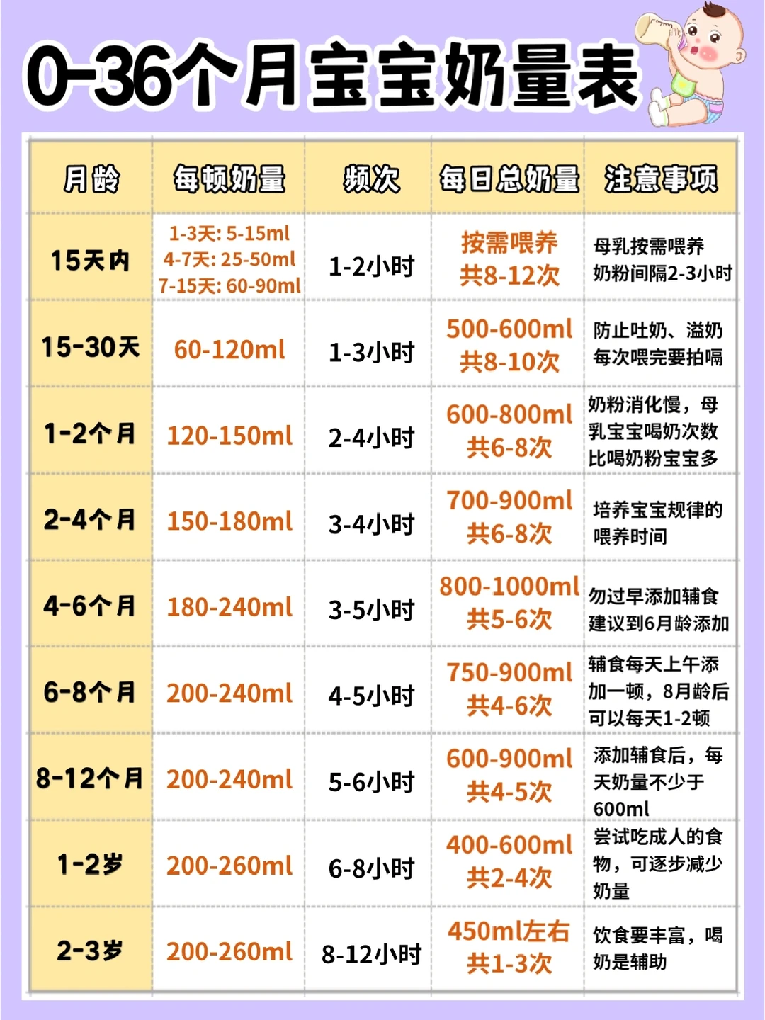 图片分享了0-36个月宝宝奶量标准参考,避免过度喂养,增加宝宝消化负担。