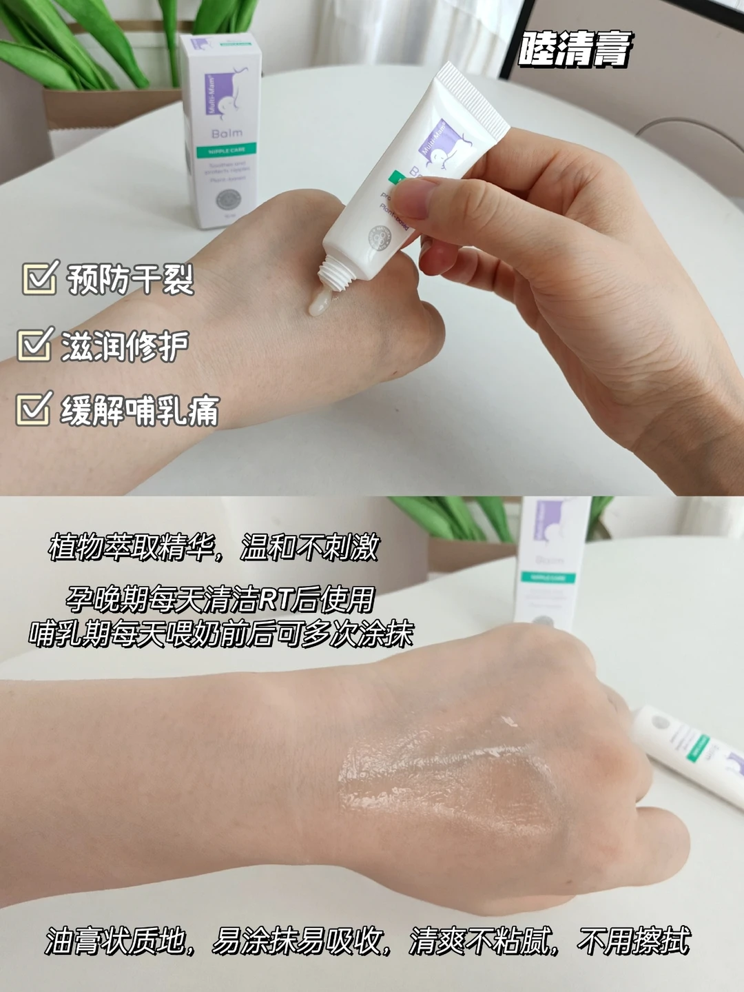 🔹生产后,因为宝宝频繁吸吮,乳头不断被刺激,乳头的护理就尤为重要了。我在哺乳期的时候,因为没有提前预防,等到乳头破皮、水肿了,才开始用羊脂膏,这是我孕期待产包提前准备的,但是对于破皮来说,见效缓慢,还没等乳头恢复,就要继续给宝宝喂奶,幸好在妈妈群里吐苦水后,她们介绍了这款睦清乳头膏,每次在喂奶前和喂奶后都涂抹,真的缓和了很多,跟我之前买的羊脂膏相比,这款更轻薄,吸收的更快,每次喂奶前也不用擦拭,不像羊脂膏,比较厚重黏腻,不容易吸收,含动物性脂肪有激su残留,每喂奶前要先清洁掉,不然不放心。