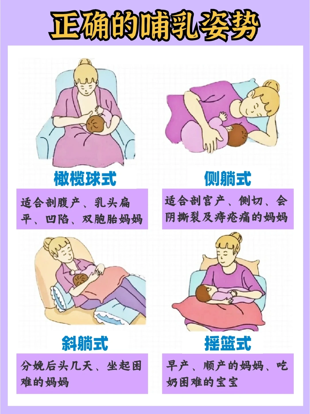 一般常用的4种哺乳姿势是:橄榄球式、侧躺式、斜躺式、摇篮式。可以根据产后妈妈和宝宝的自身情况,选择方便舒适的姿势。
