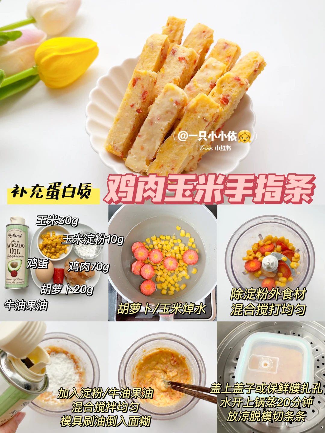 🔹食材:鸡肉、胡萝卜、玉米、鸡蛋、玉米淀粉、牛油果油