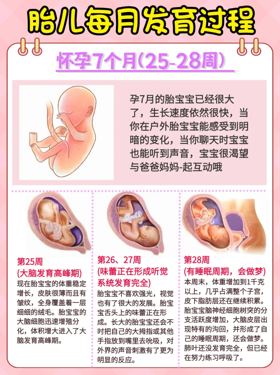 胎宝宝发育:肌肉发育完善。大脑神经细胞进一步发育,有了思维活动
