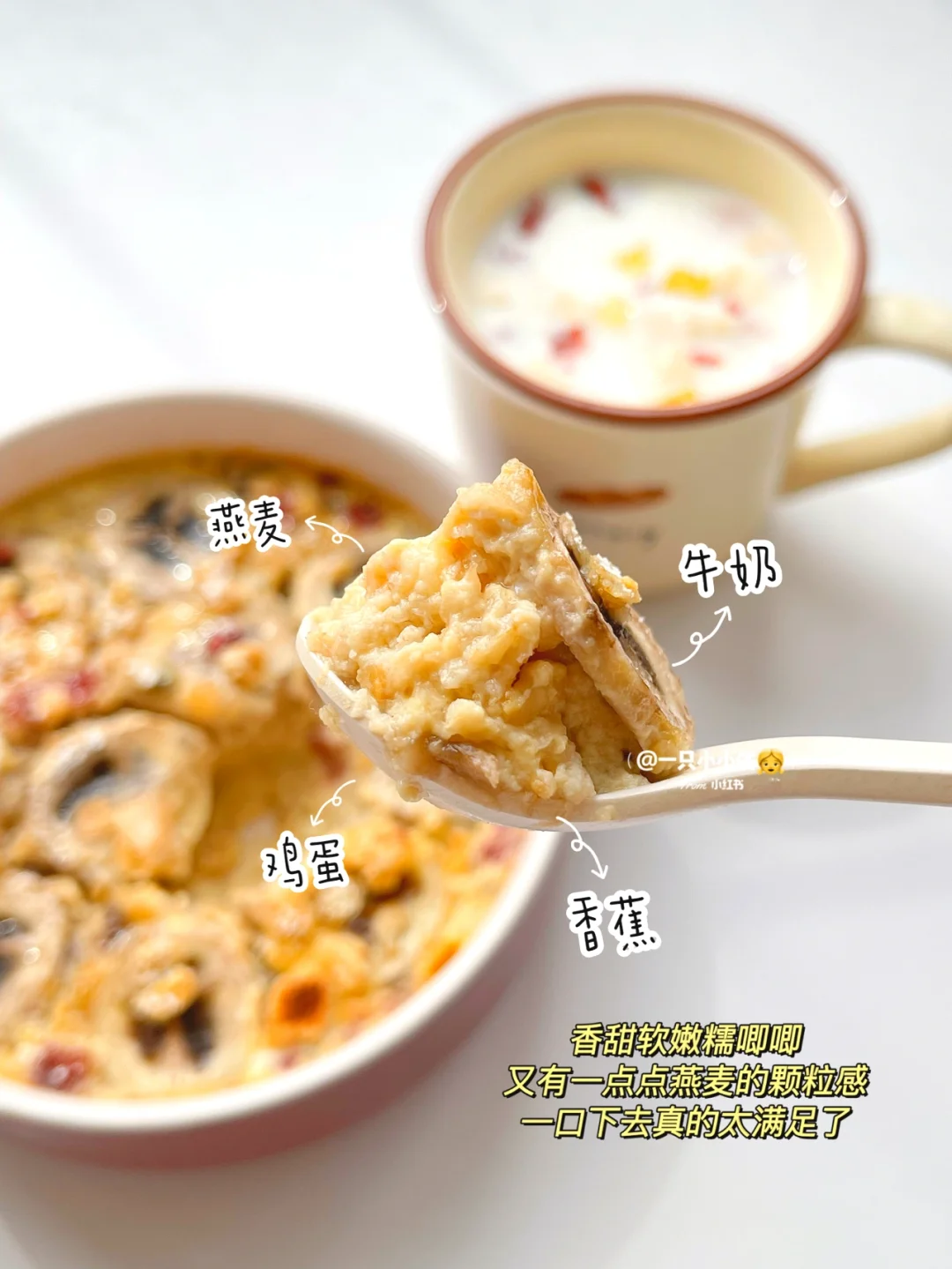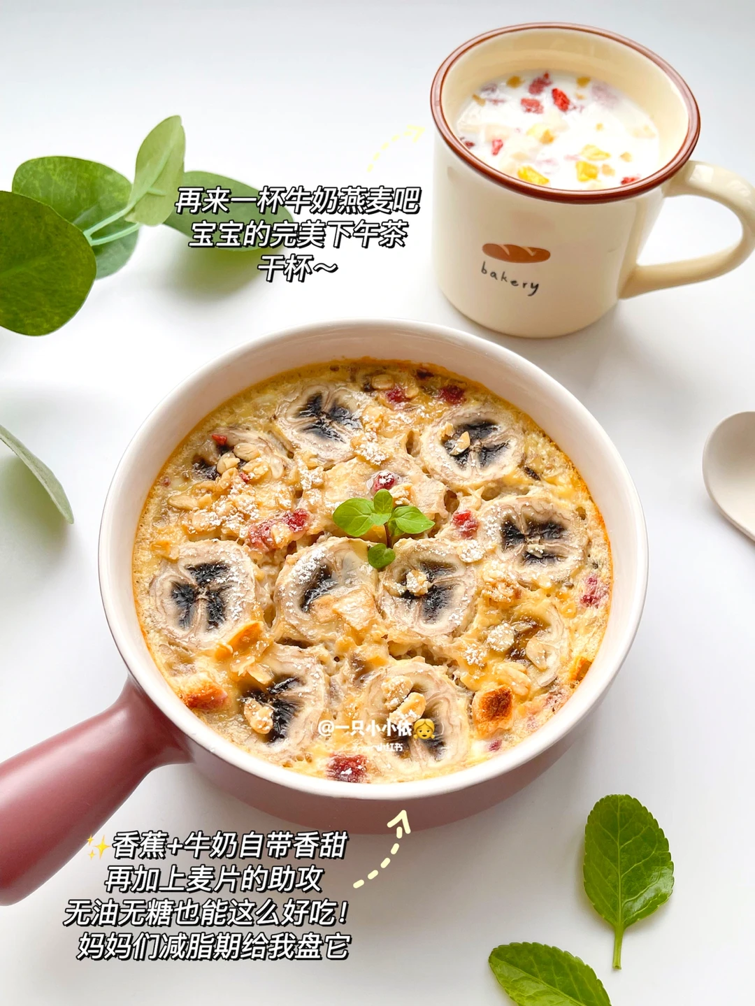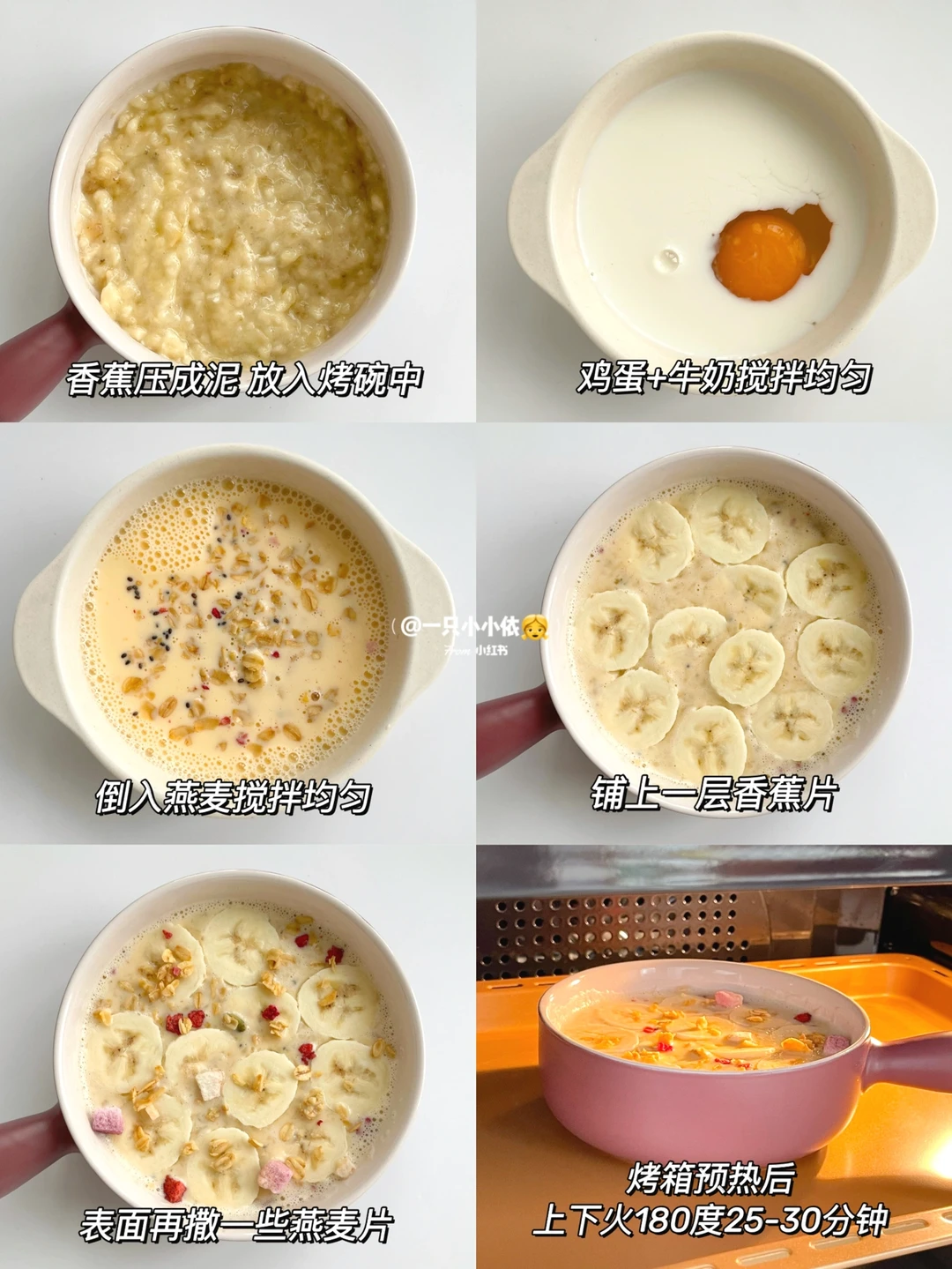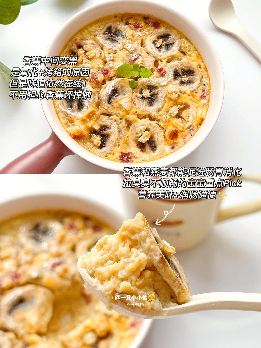 🍌软糯香甜的宝宝香蕉燕麦布丁,真的是我做过最简单的自制小甜点了!只需要搅一搅、拌一拌就能成功,不存在翻车👏🏻👏🏻 ✨牛奶+香蕉自带甜味,燕麦的加入增加了一点点颗粒感,润肠通便促消化,当作早餐或下午茶棒棒的,还可以锻炼宝宝咀嚼能力哦!减脂期妈妈也能一起吃,详细教程来啦[斜眼R] . 🌈你需要准备—— 🔸牛奶或配方奶100ml 🔹香蕉1根 🔸燕麦30g 🔹鸡蛋1个 . 🌈制作步骤—— 1⃣️香蕉捣碎放入烤碗中,牛奶+鸡蛋搅拌均匀; 2⃣️燕麦倒入牛奶中搅拌均匀,铺上一层香蕉片,再撒少许燕麦片; 3⃣️烤箱预热后,上下火180度25-30分钟就好啦,具体时间以自家烤箱为准哦✅ . 软糯香甜的宝宝自制下午茶,快安排吧~平常也可以直接给宝宝吃这个儿童麦片哦[飞吻R]