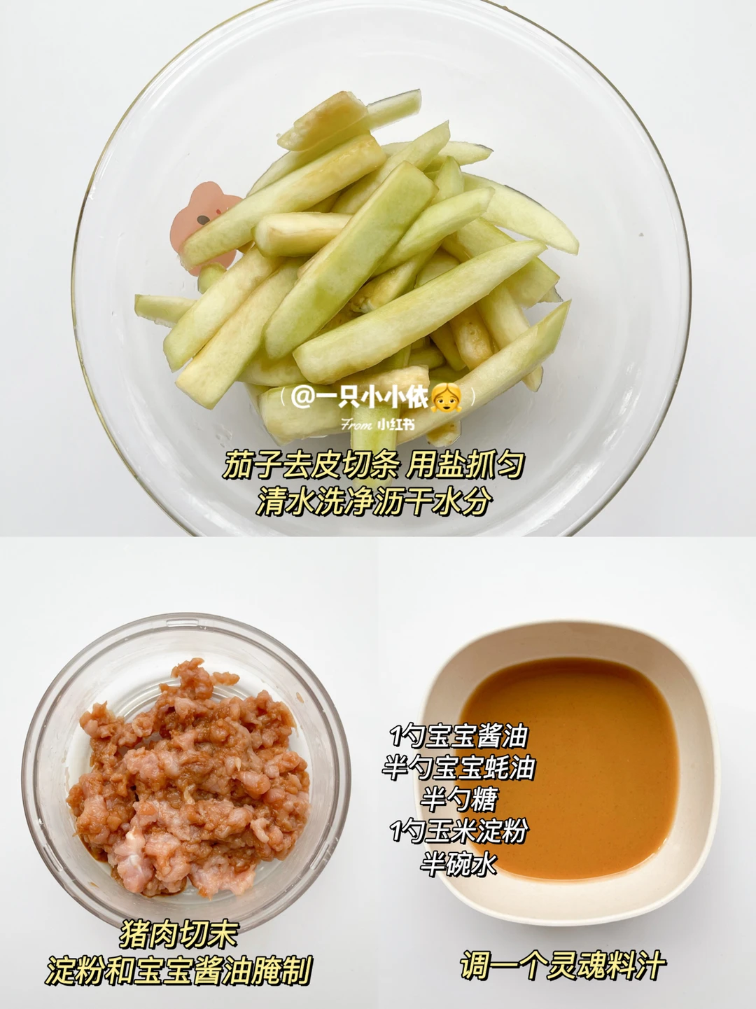 1⃣️茄子去皮切条,用盐抓匀,清水洗净沥干水分;