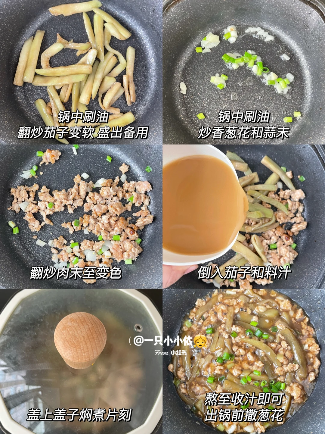 5⃣️锅中刷油,炒香葱花和蒜末,倒入肉末翻炒至变色,再倒入茄子和料汁,焖煮至汤汁浓郁,出锅前撒葱花✅