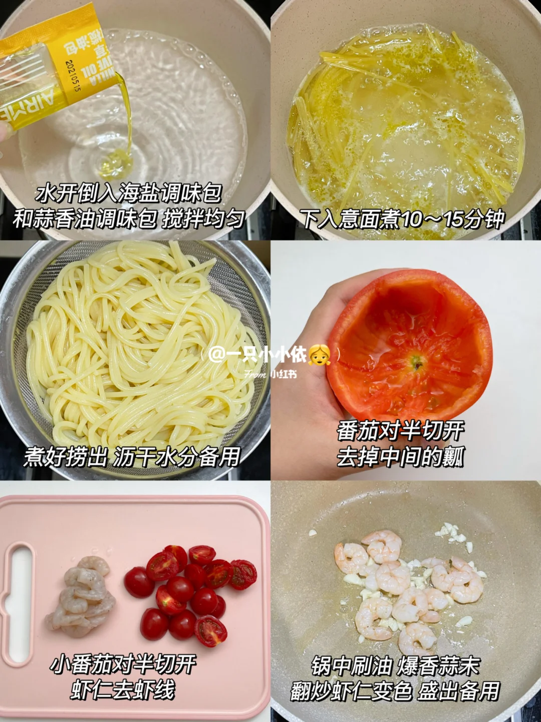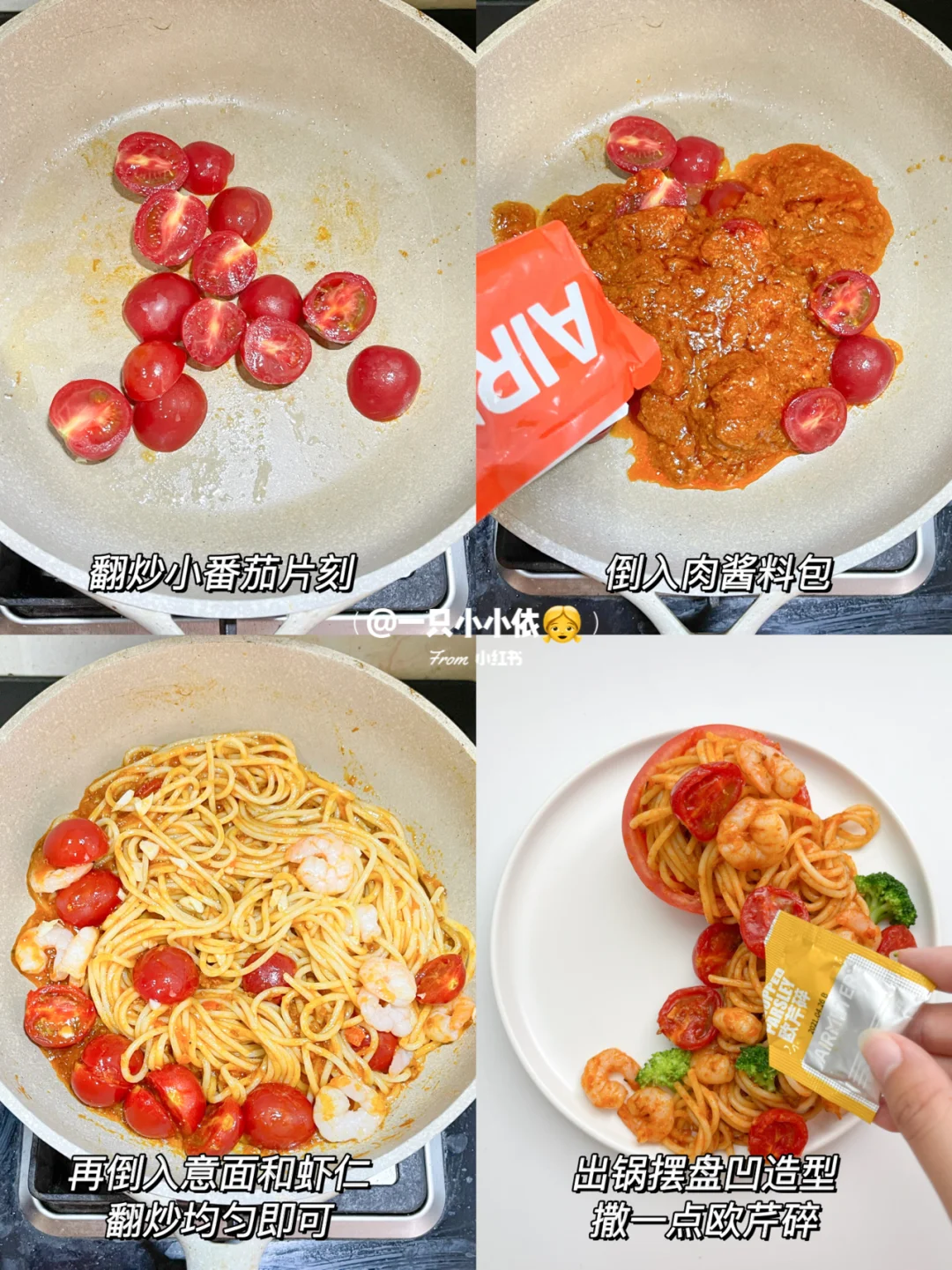 🔹食材:番茄肉酱意面1盒、番茄、虾仁、小番茄