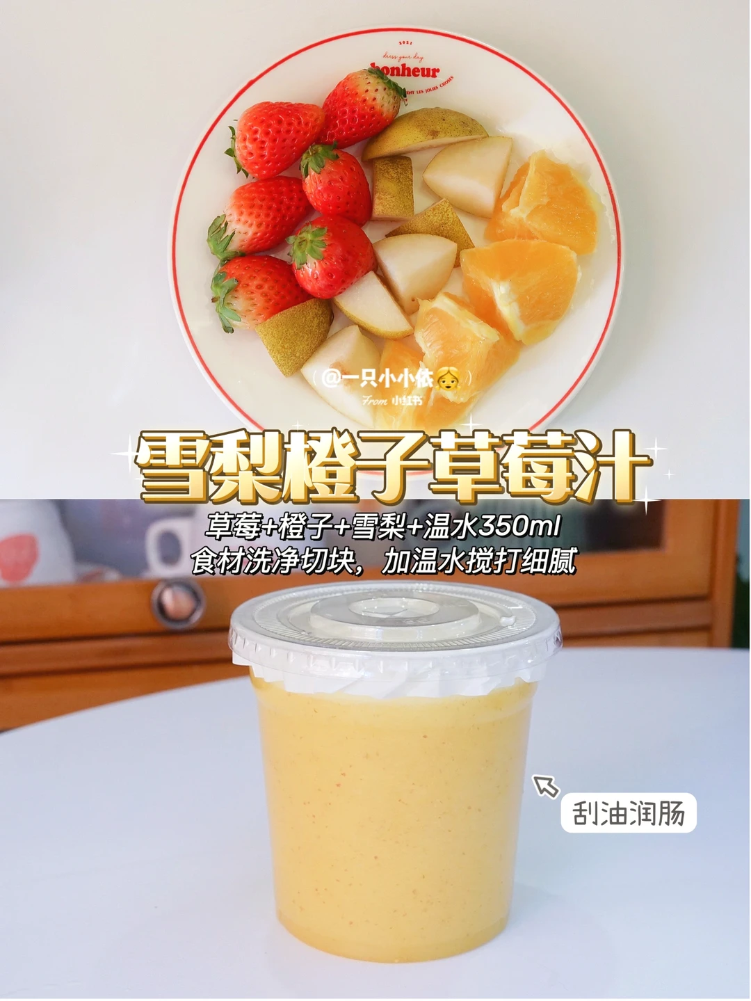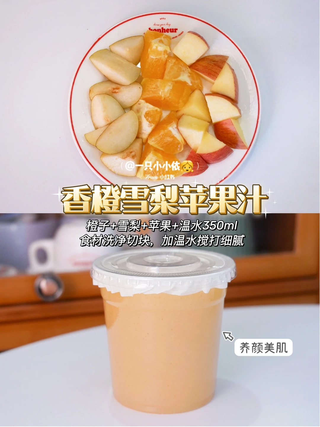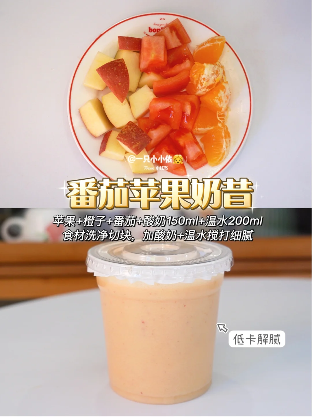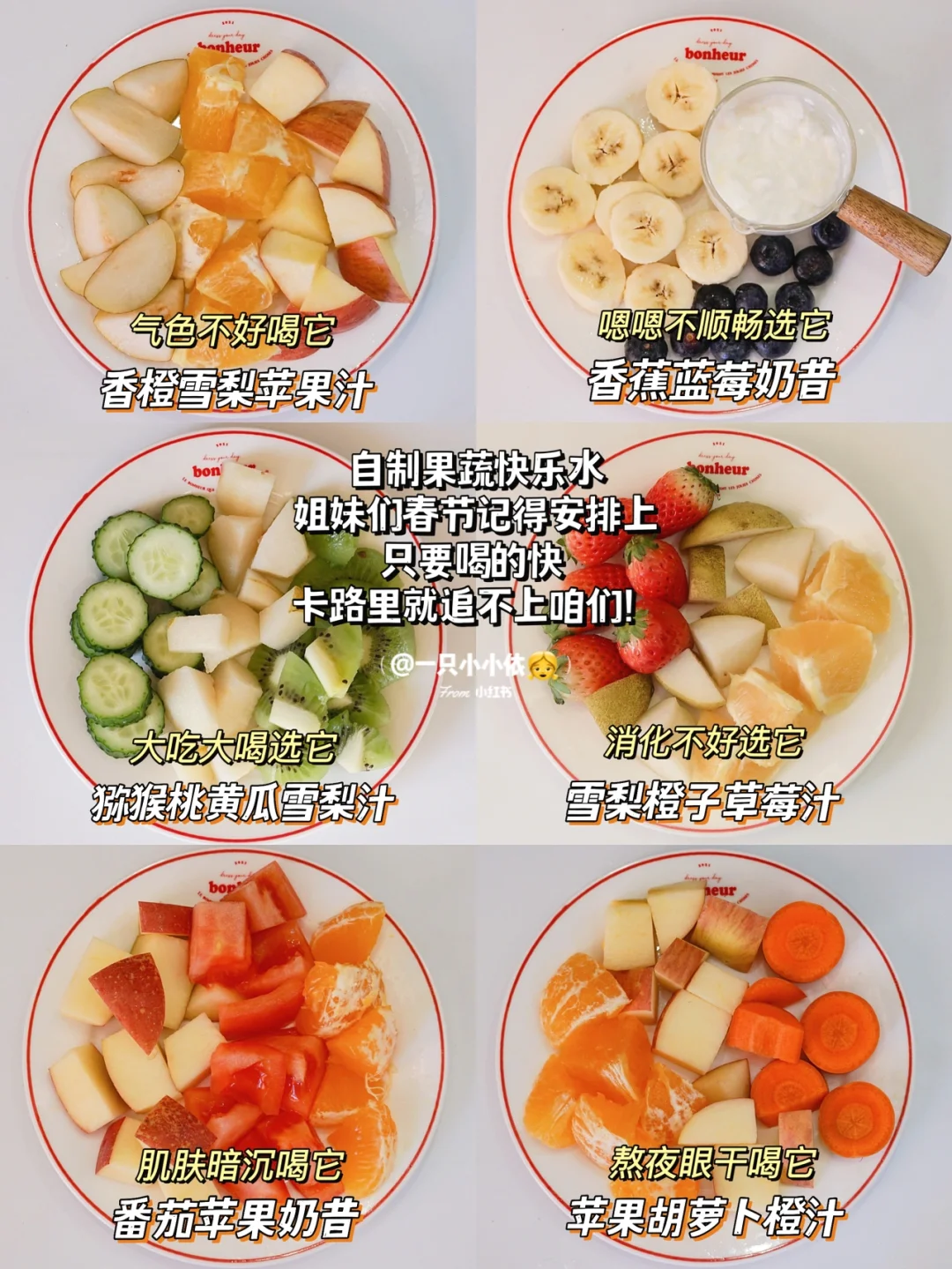 🍻吨吨吨,快干了这杯果蔬汁!💁‍♀️S码的快乐我不允许姐妹们没有~ 🧨春节的饭局儿一场接一场,超怕称体重😔不过咱仙女们不怕,6种健康营养的自制果蔬汁来了✨都是很常见的水果蔬菜,低卡低脂,补充各种维生素,谁还要奶茶啊!! · ✨自制果蔬汁适用于各种减脂期、孕期、哺乳期、身材恢复期的姐妹哦 ✨因为都是天然水果蔬菜,所以宝宝也能一起喝 ✨用破壁机、料理机、料理棒搅打都可以 ✨喜欢喝浓稠口感的可以少加些水,注意是温开水 ✨榨出来后尽快喝完,不然维C容易氧化 · ———✨一周不重样自制果蔬汁✨——— · Day 1:低卡解腻 👉番茄+苹果+橙子+酸奶150ml+温水200ml Day 2:刮油润肠 👉草莓+橙子+雪梨+温水350ml Day 3:养颜美肌 👉橙子+雪梨+苹果+温水350ml Day 4:排毒抗氧化 👉香蕉+蓝莓+酸奶150ml+温水200ml Day 5:美白明目 👉苹果+胡萝卜+橙子+温水350ml Day 6:清热去火 👉猕猴桃+雪梨+黄瓜+温水350ml · 🧚‍♀️一周健康果蔬汁,双击屏幕随时抄作业! 🧚‍♀️希望姐妹们都能拥有S码的快乐!!(虽然我现在还没有,但是我会努力的) 🧚‍♀️下期见啦,Bye~