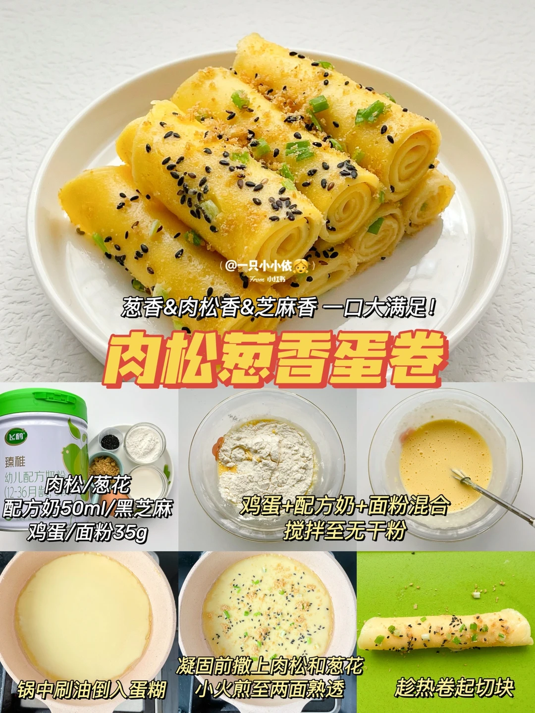 🔹做法:鸡蛋+配方奶+面粉混合,搅拌至无干粉;锅中刷油倒入蛋液,凝固前撒上肉松和葱花,小火煎至两面熟透;趁热卷起切块✅