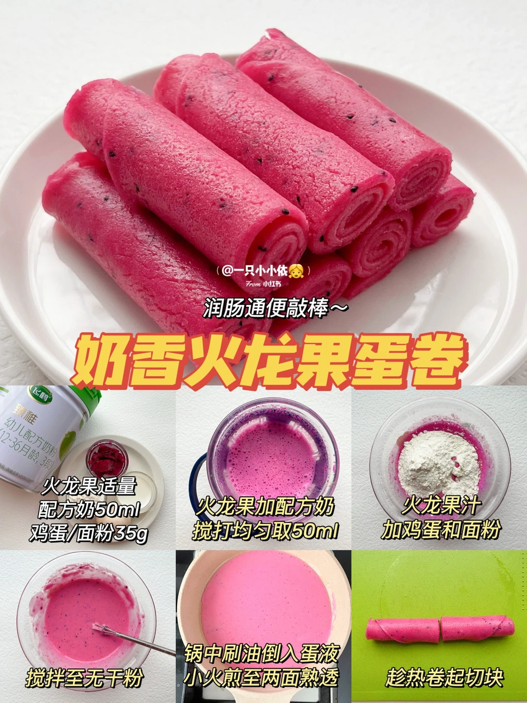 🔹做法:火龙果加配方奶搅打均匀取50ml;火龙果汁+鸡蛋+面粉搅拌至无干粉;锅中刷油倒入蛋液,小火煎至两面熟透;趁热卷起切块✅