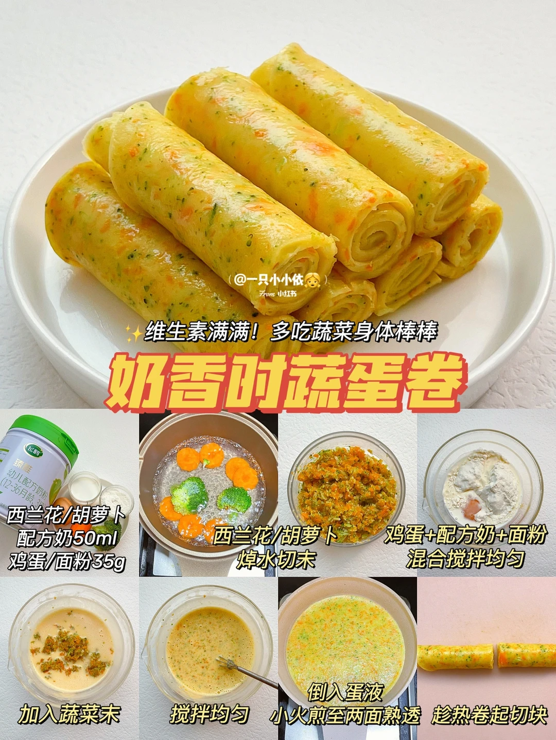 🔹做法:西兰花和胡萝卜焯水切末;鸡蛋+配方奶+面粉混合搅拌均匀,再加入蔬菜末搅拌均匀;锅中刷油倒入蛋液,小火煎至两面熟透;趁热卷起切块✅