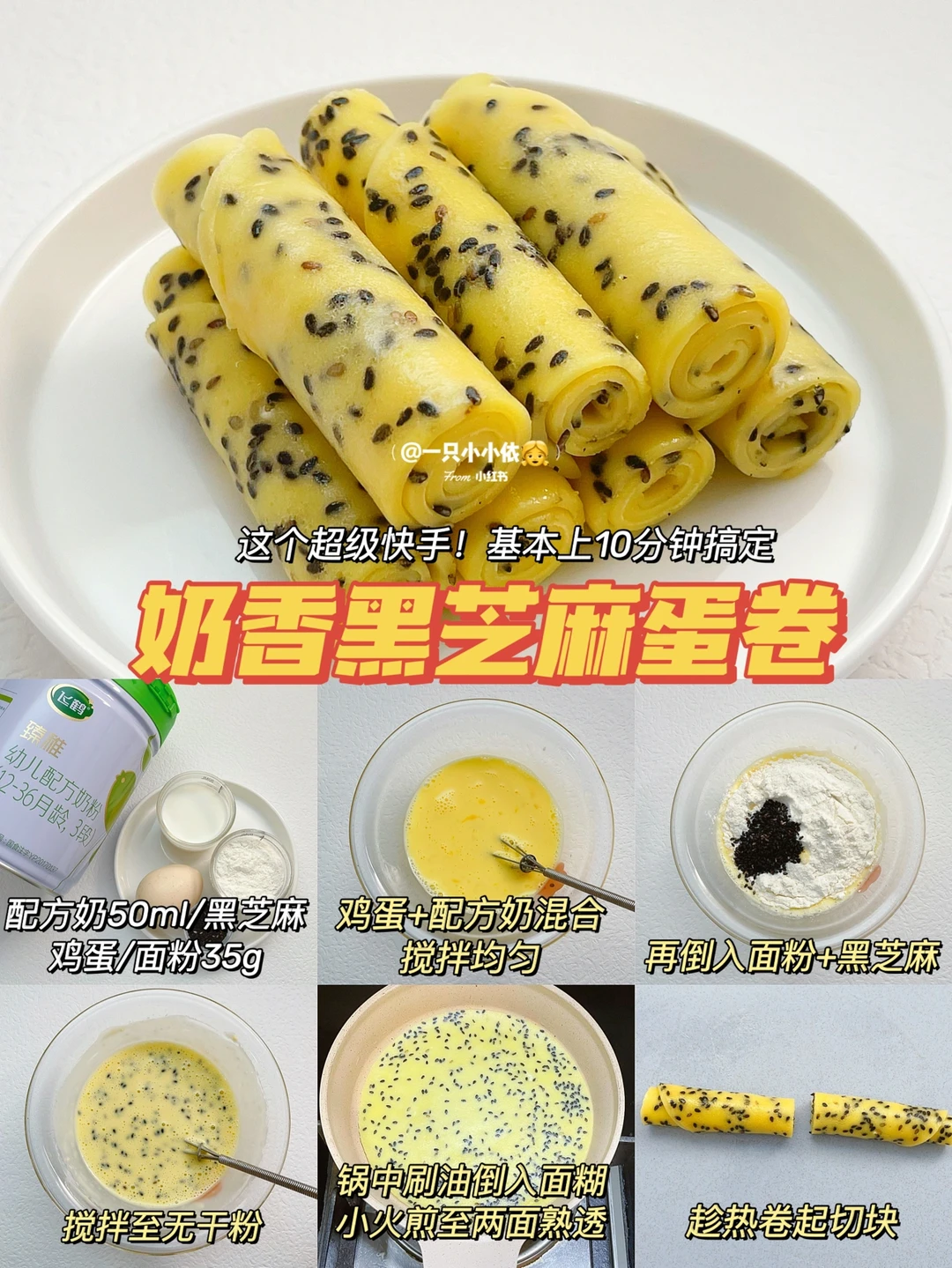 🔹做法:鸡蛋+配方奶混合搅拌均匀,倒入面粉+黑芝麻搅拌至无干粉;锅中刷油倒入面糊,小火煎至两面熟透;趁热卷起切块✅