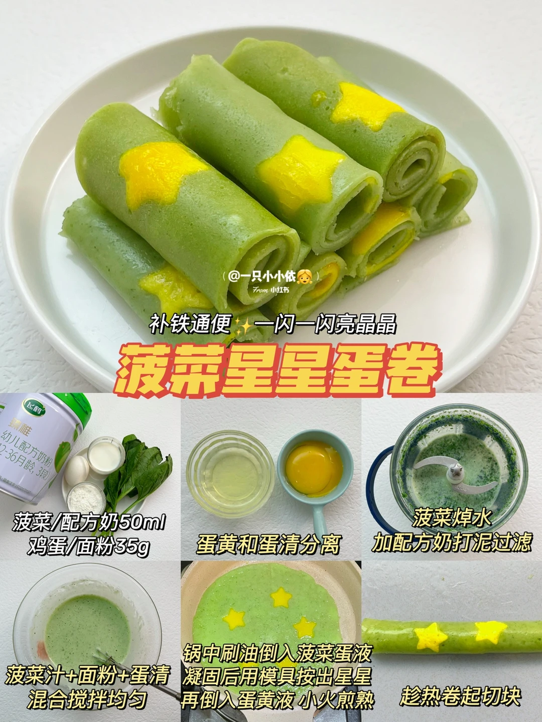 🔹做法:蛋黄和蛋清分离备用;菠菜焯水加配方奶打泥过滤;菠菜汁+面粉+蛋清混合搅拌均匀;锅中刷油倒入菠菜蛋液,凝固后用模具按出星星,再倒入蛋黄液,小火煎熟;趁热卷起切块✅