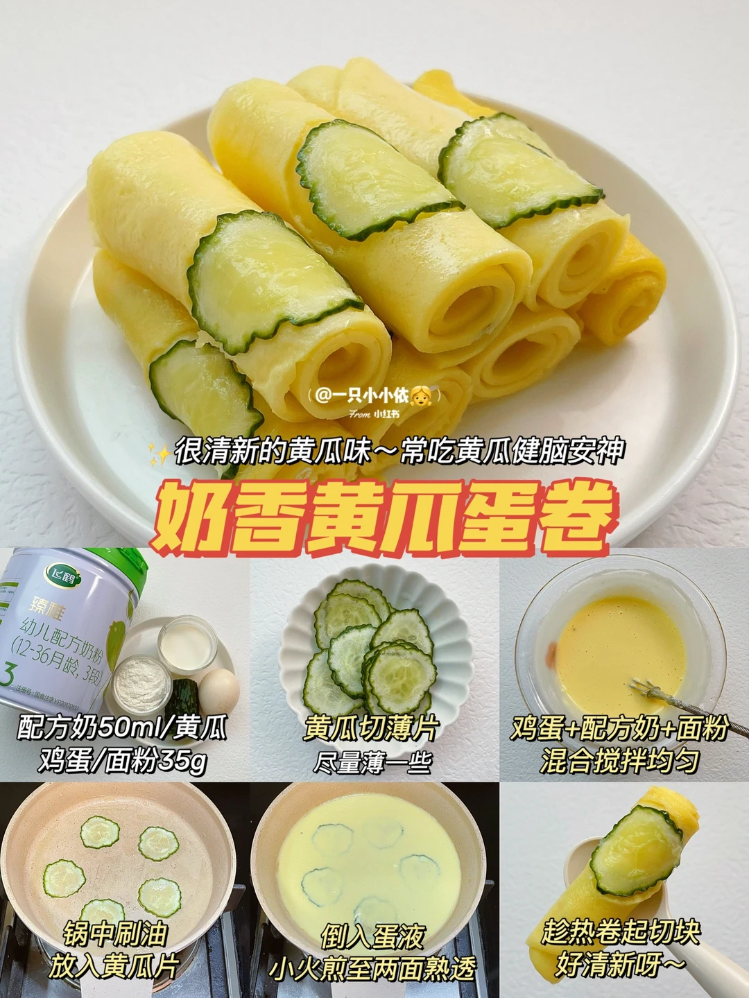 🔹做法:黄瓜切薄片;鸡蛋+配方奶+面粉混合搅拌均匀;锅中刷油放入黄瓜片,倒入蛋液,小火煎至两面熟透;趁热卷起切块✅